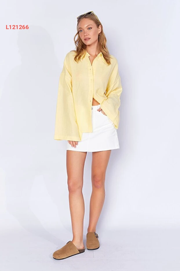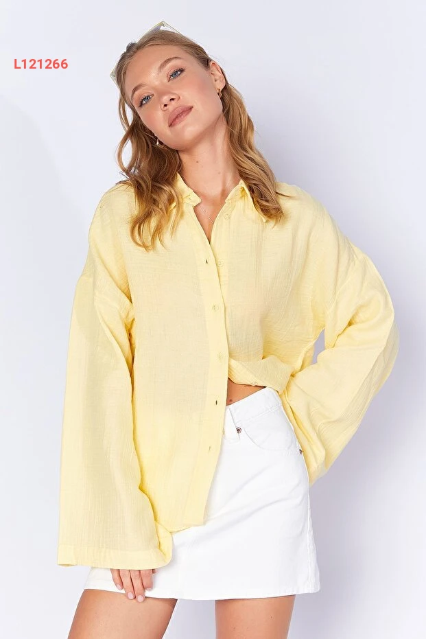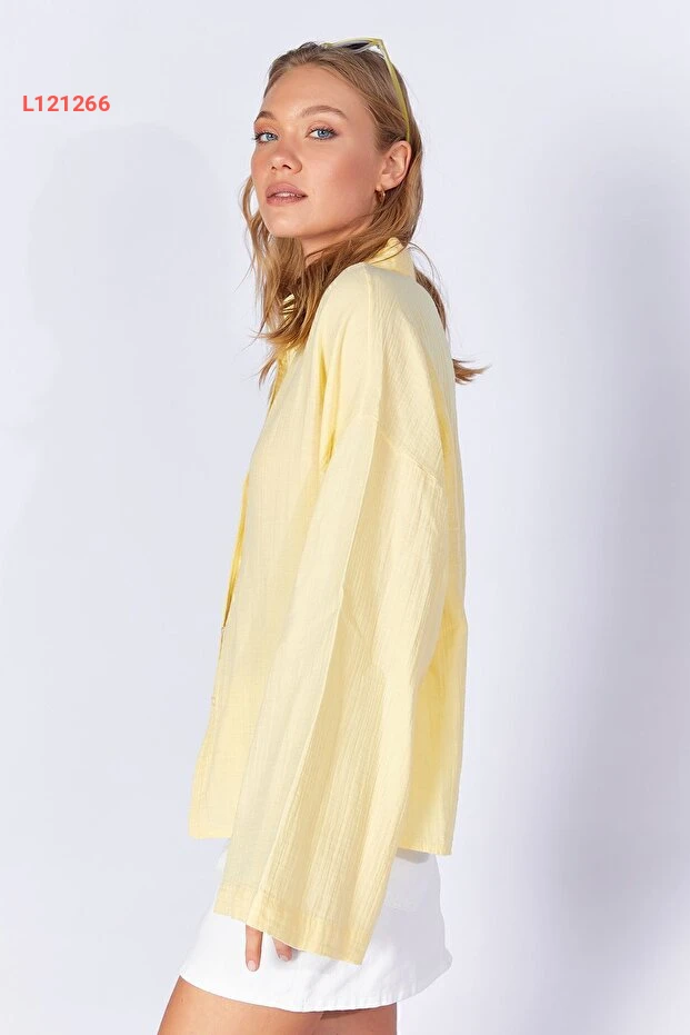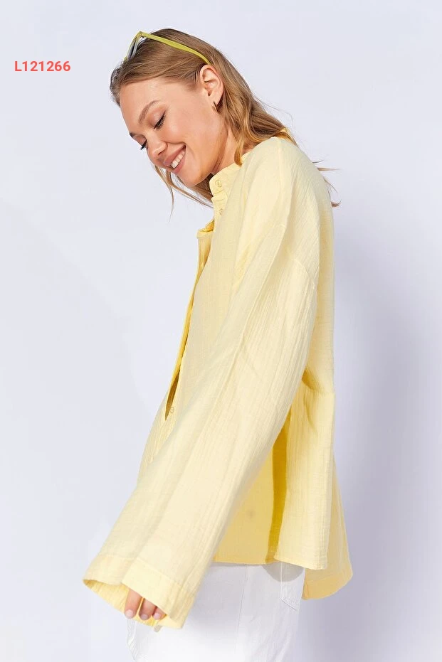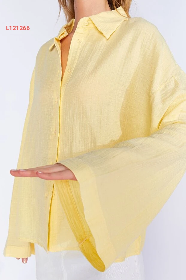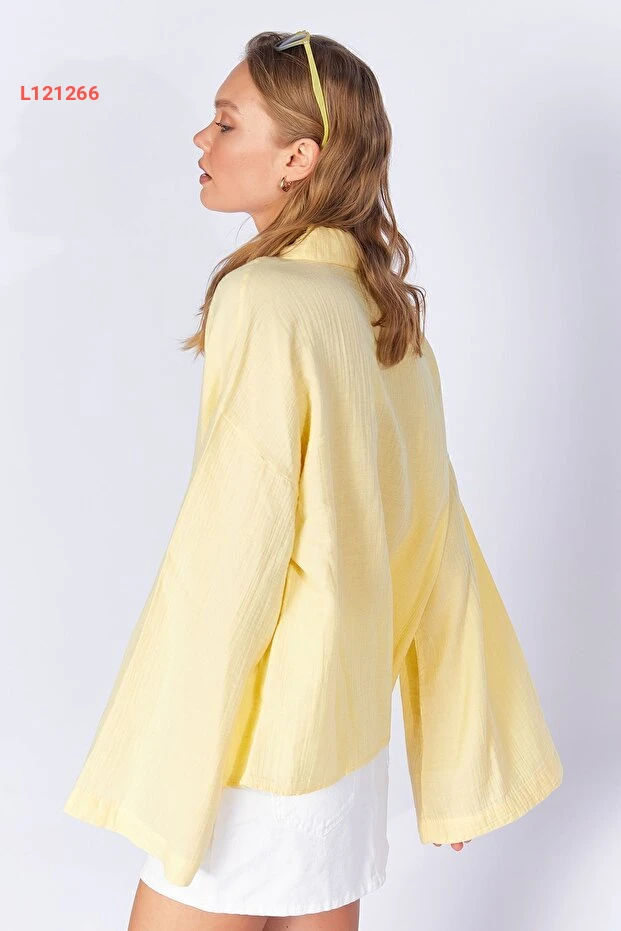 قميص أساسي نسائي بكم واسع من قماش موسلين الأصفر الليموني