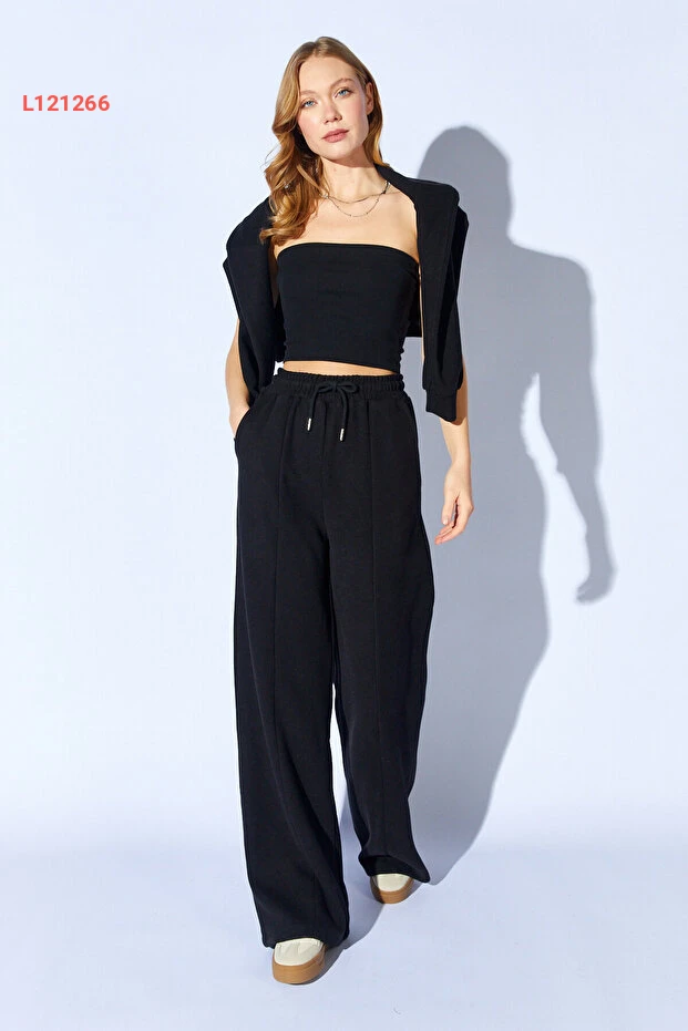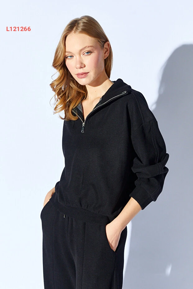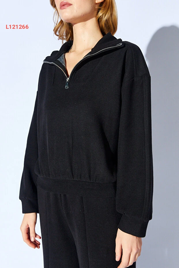 اكتشفي أناقتك مع طقم EDITION WOMAN، الذي يتكون من سويت شيرت أسود بزاوية نصف سحاب وسروال مزود بحزام مطاطي وتفاصيل أنيقة. تصميمه العصري يوفر لك الراحة والمرونة، مثالي لمناسباتك اليومية والأنشطة الرياضية. ارتدي هذا الطقم لإطلالة تجمع بين الأناقة والراحة effortlessly!