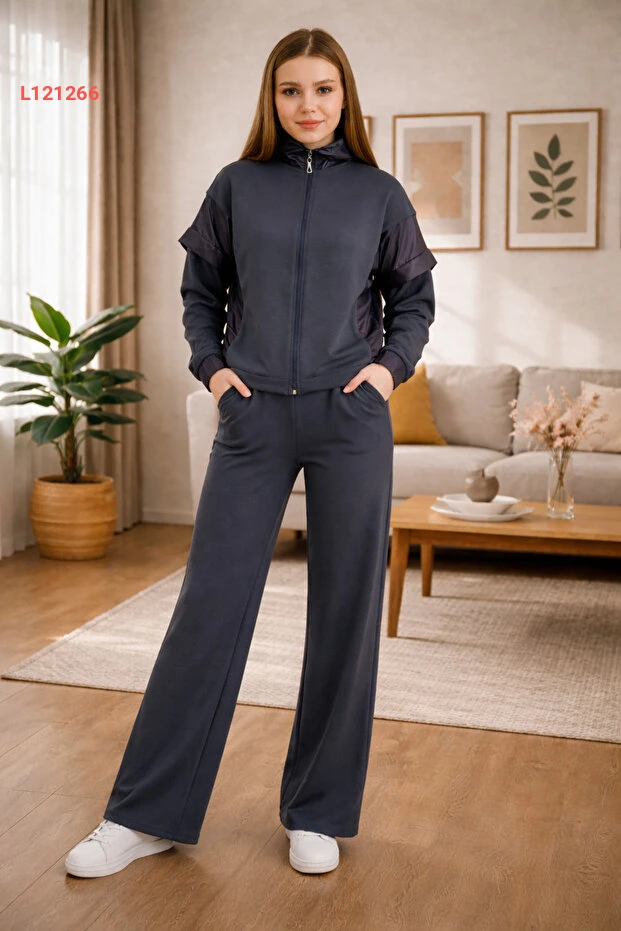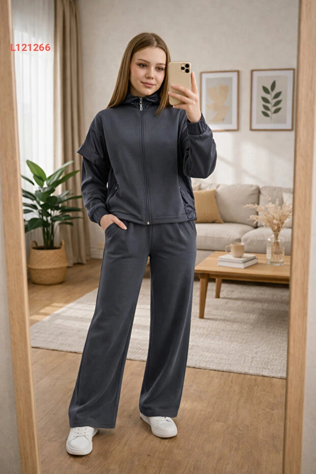 طقم إكواليتي للنساء من قماش المودال بقلنسوة وسحاب مع تفاصيل قماش باراشوت