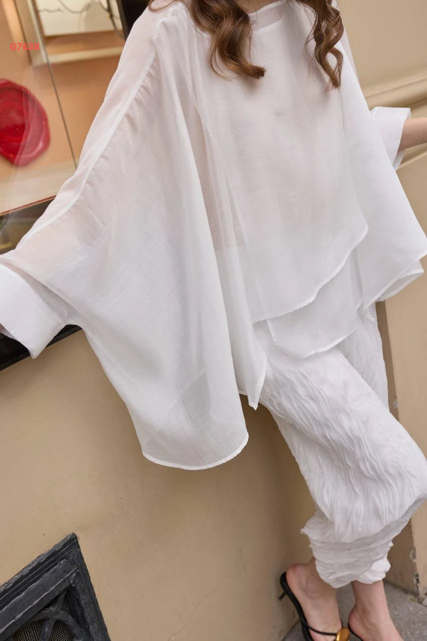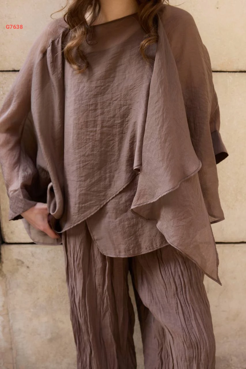 طقم بنطال مجعد وبلوزة شيفون كشكش