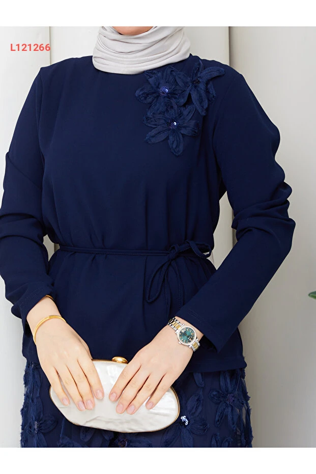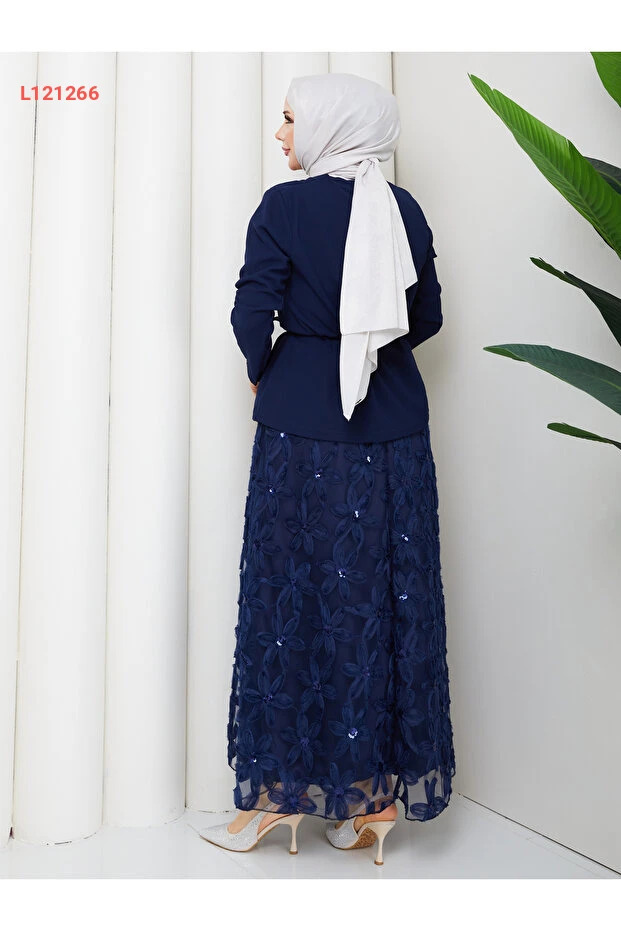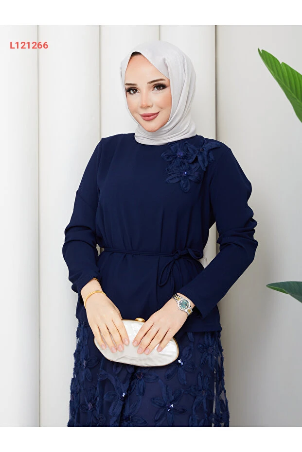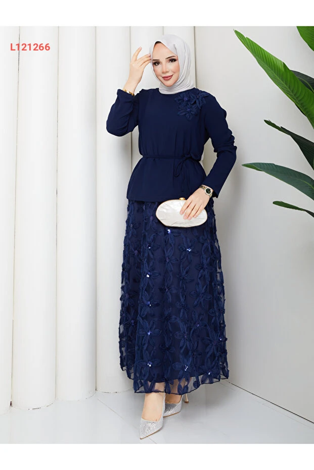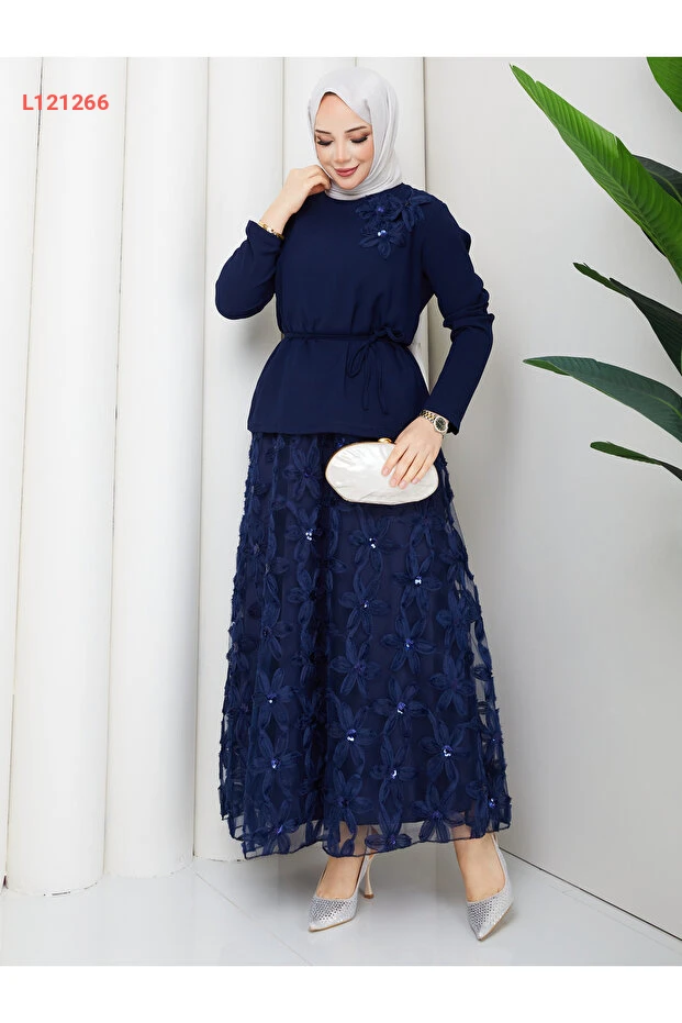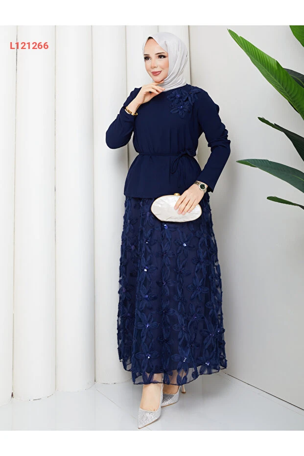 استمتعي بأناقتك مع طقم "Wual giyim" المُصمم خصيصًا للسيدات، الذي يضم أعلى مصمم بتفاصيل زهرية أنيقة. يتميز الطقم بخصر مزين بحزام يمنحك إطلالة متناسقة، بالإضافة إلى تنورة بتصميم يشبه الدانتيل لإطلالة تجمع بين الجمال والاحتشام. اجعلي كل مناسبة مميزة مع هذا الطقم الرائع!