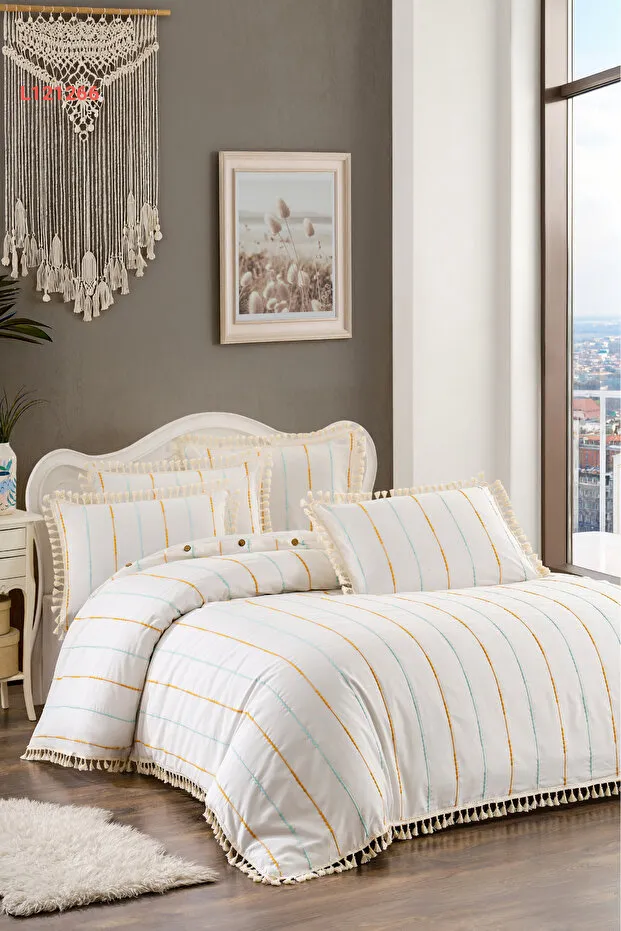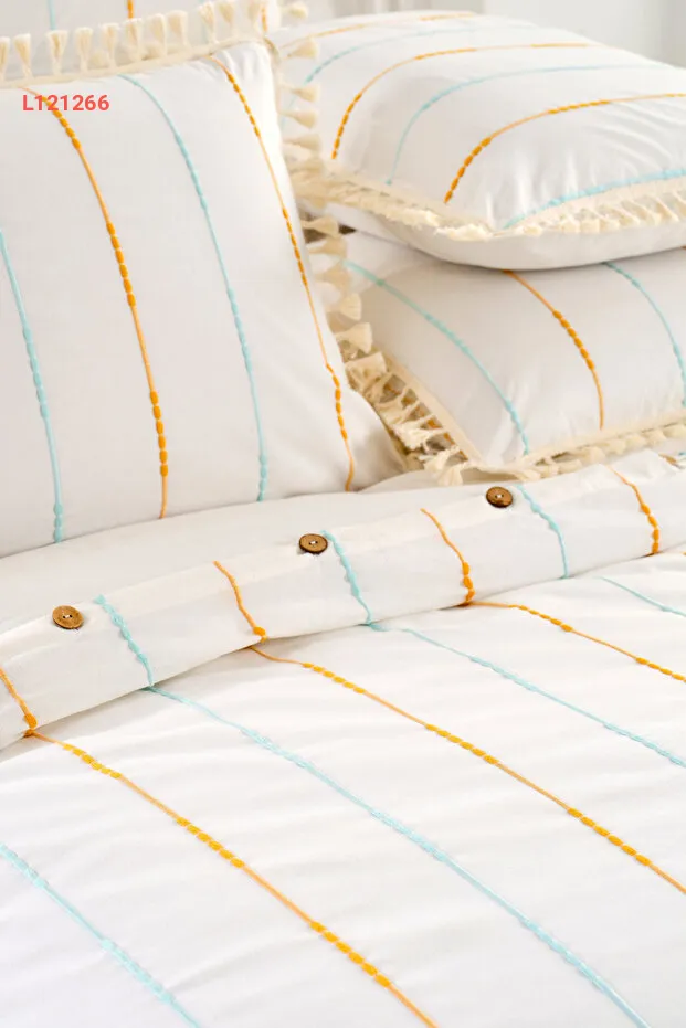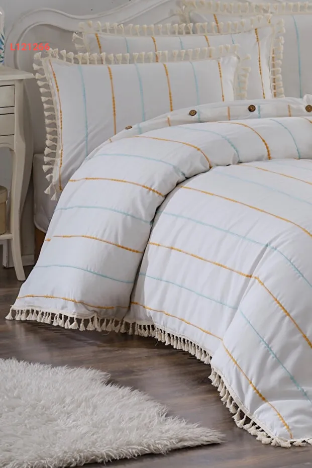 استمتع بتجربة نوم فاخرة مع مجموعة XVA Yadens المكونة من لحاف مزدوج من القطن، المزينة بأزرار أنيقة وشرائط متميزة تضفي لمسة من الأناقة على غرفة نومك. تتميز الأقمشة الناعمة بتنظيم الحرارة وامتصاص الرطوبة، مما يضمن لك راحة مثالية ليلاً، بينما تضفي الألوان العصرية طابعاً مميزاً على ديكورك.