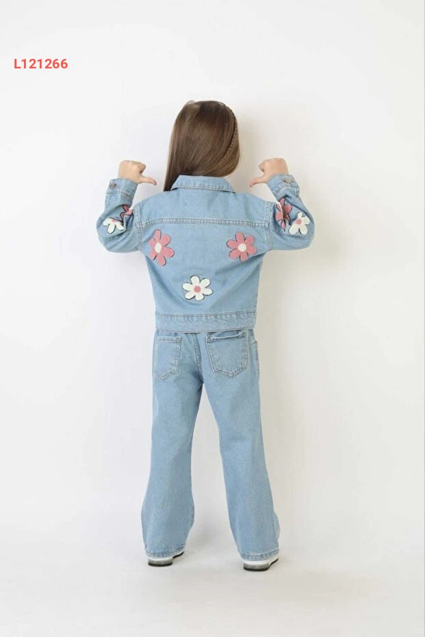 طقم جينز للفتيات بلون أزرق مزين بنقوش زهرية - يحتوي على بنطال وجاكيت مطرزة المناسبات