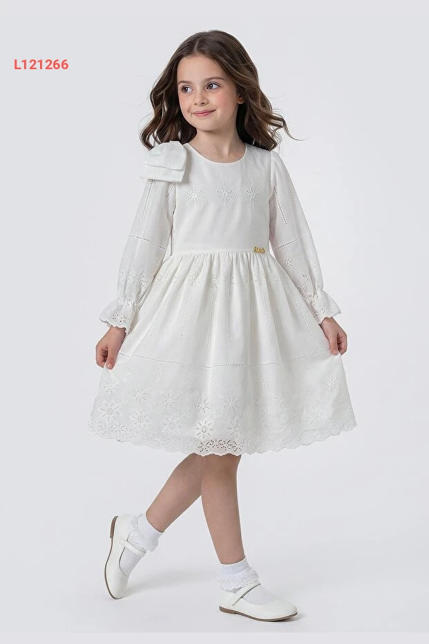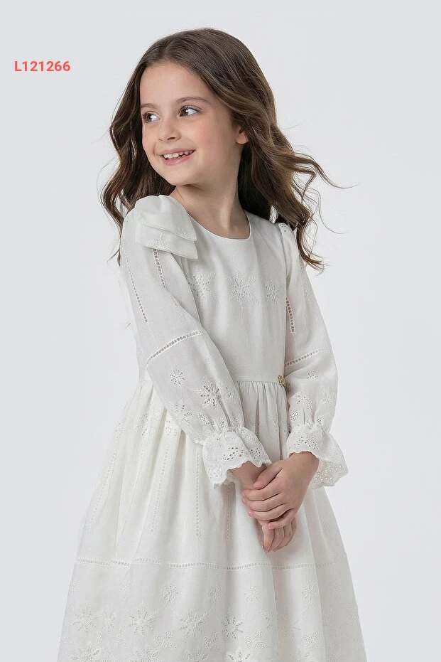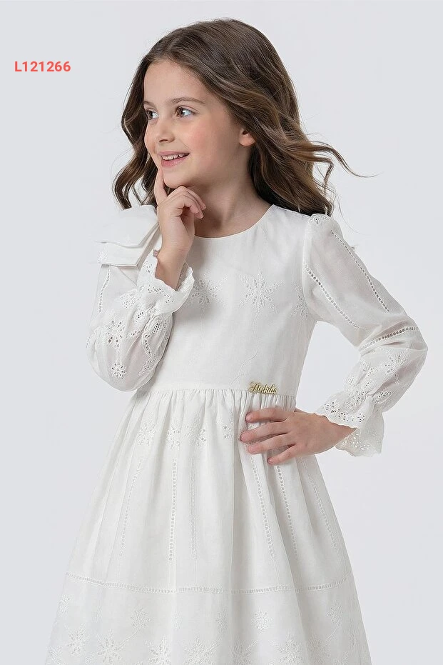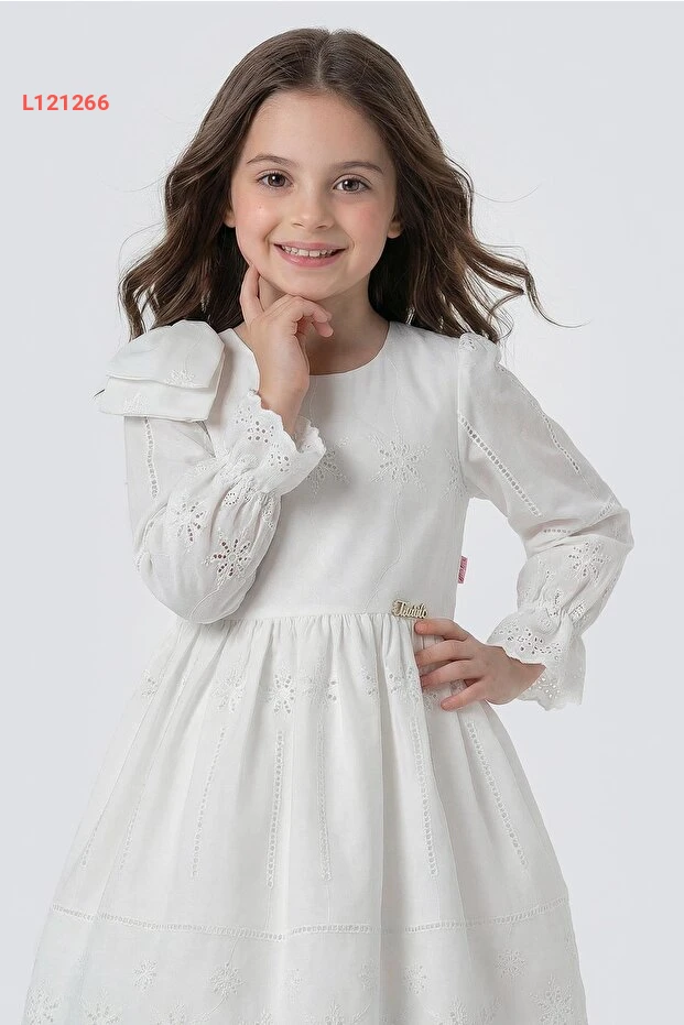 فستان أطفال زازيكو بنمط الأكتاف المزينة بلفة أنيقة وأكمام طويلة