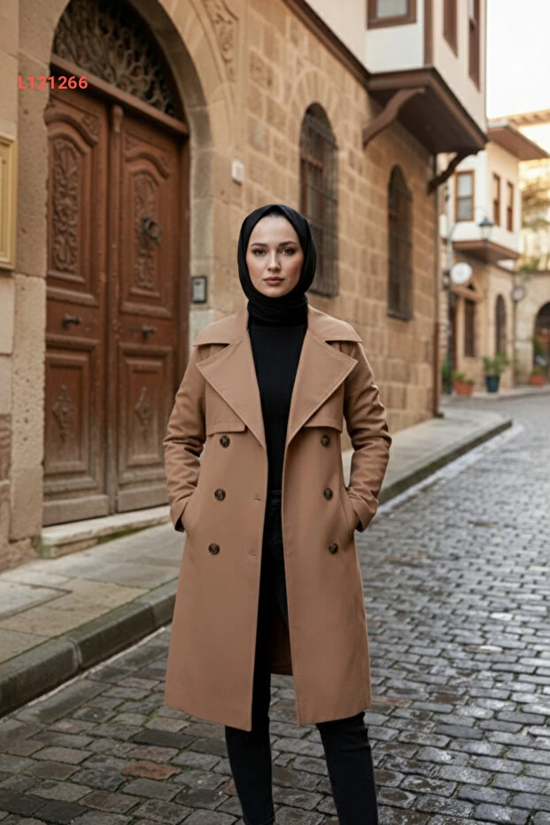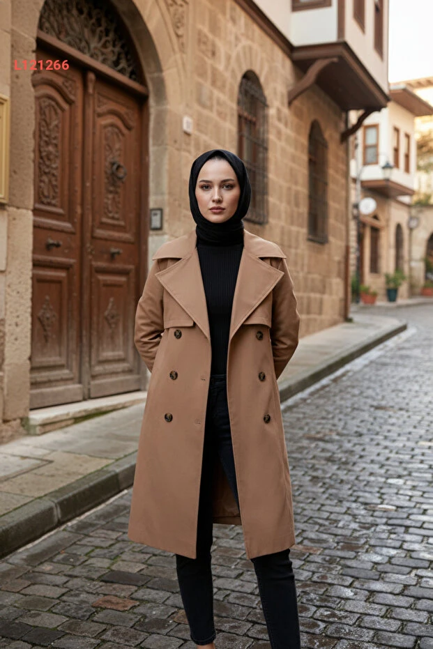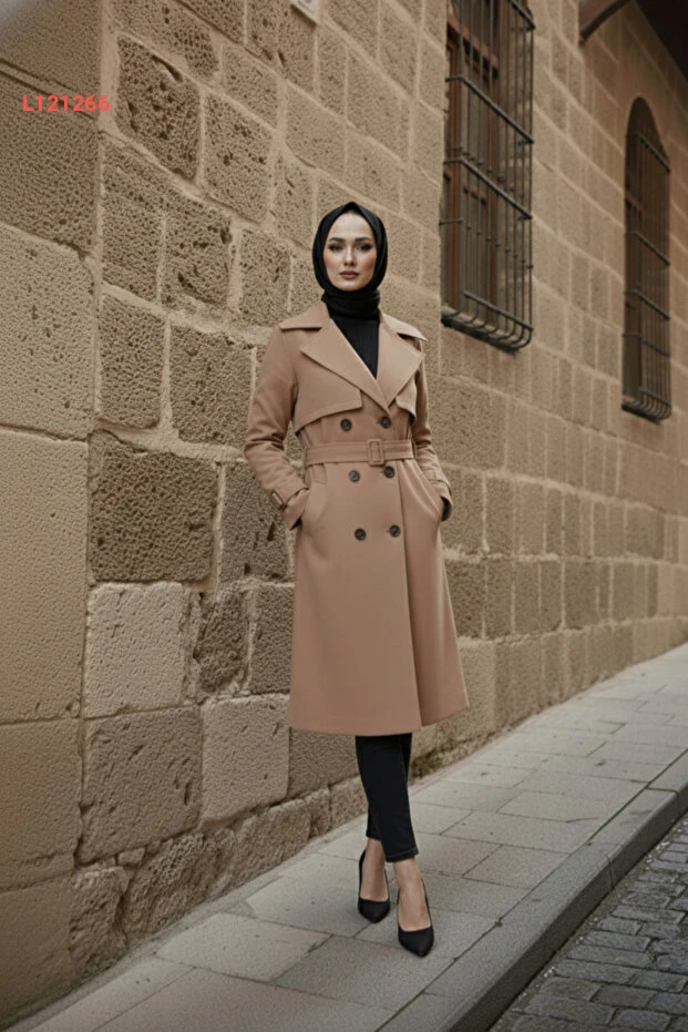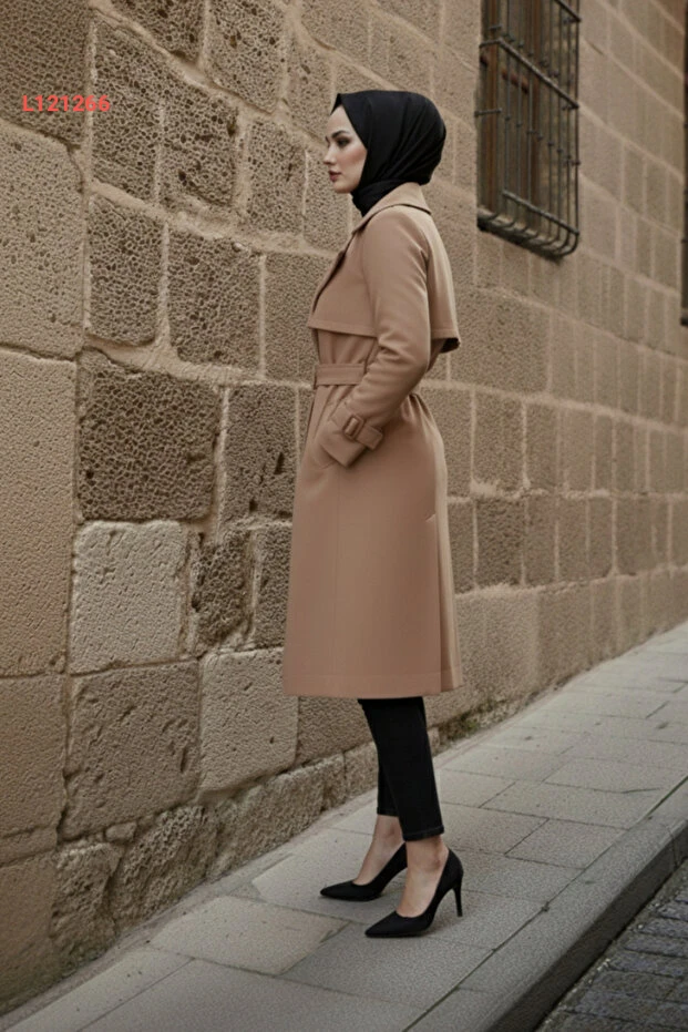 مجموعة زينيفا: ترينشوت نسائي محجبات لون بيج غامق 100% قطن مع حزام بطول 95 سم