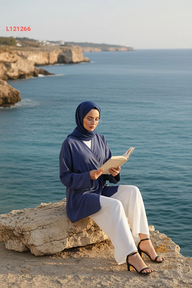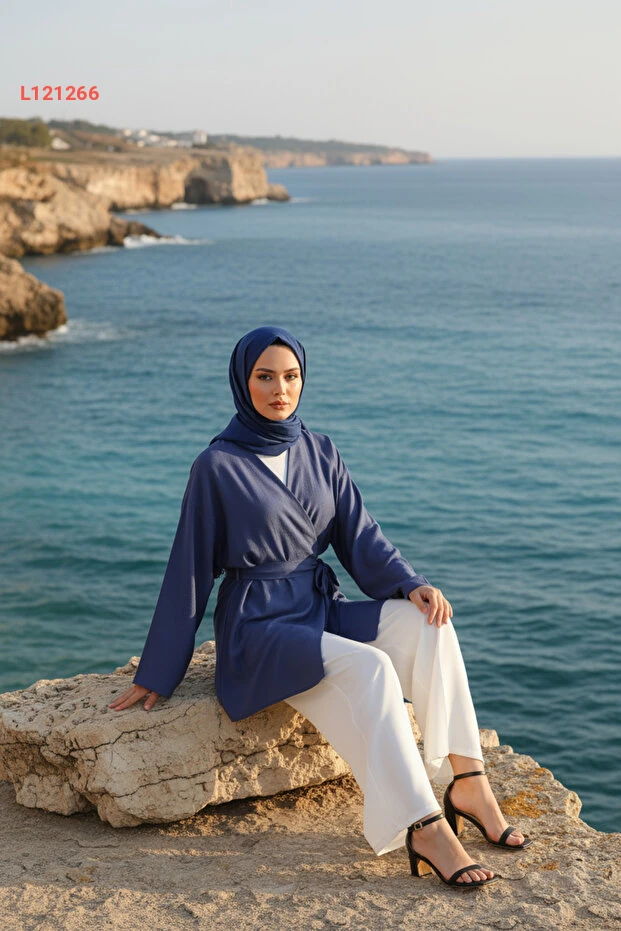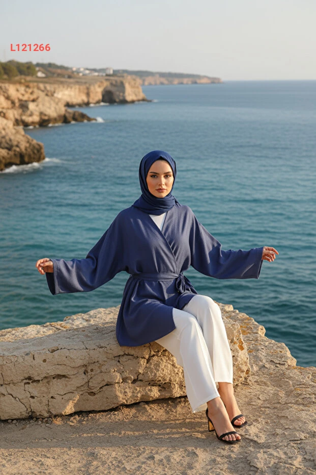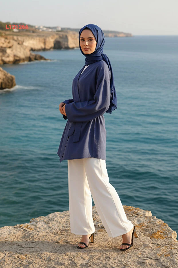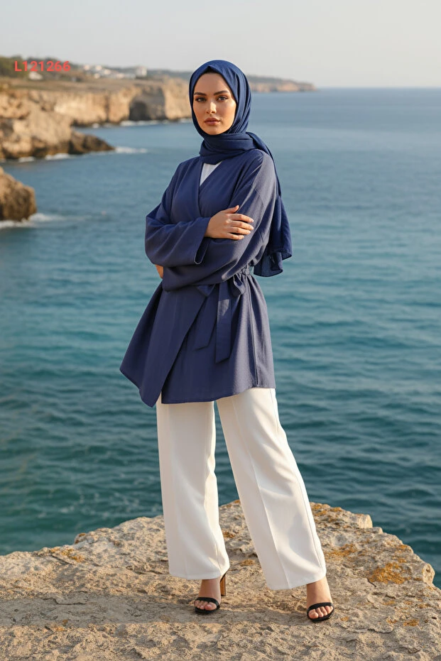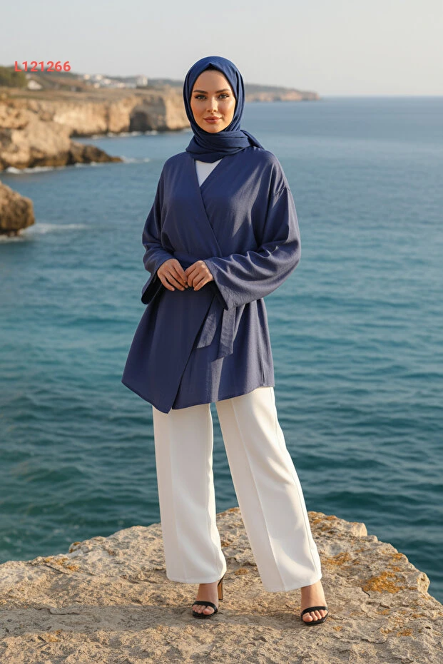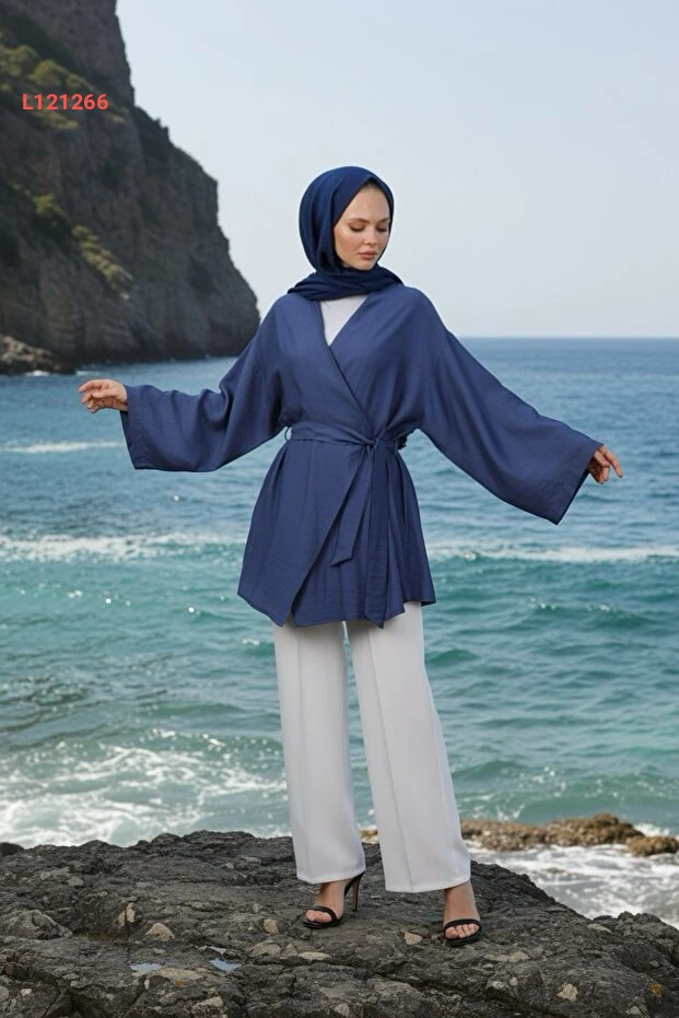 كيمونو المرأة المحتشمة بجيب وحزام من قماش فسكوز طبيعي - مجموعة زينيفا - أزرق إنديغو