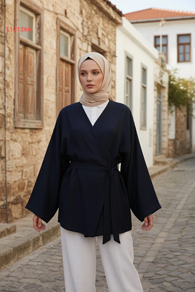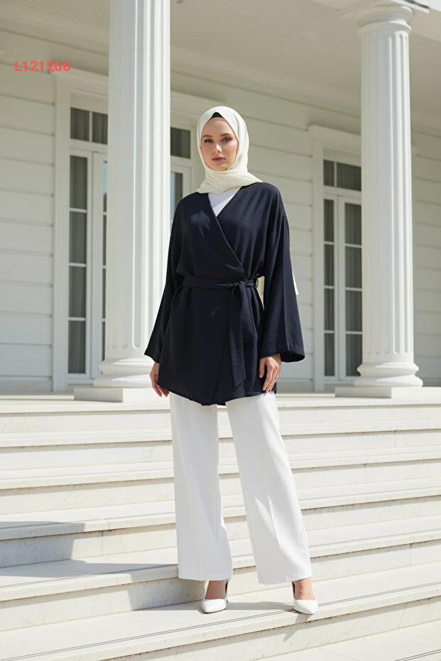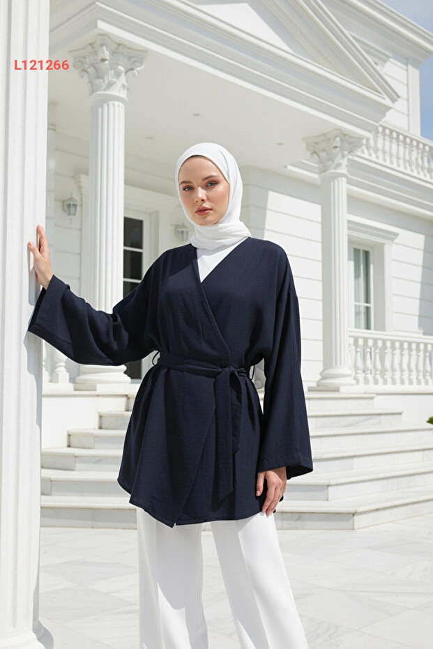 استمتعي بأناقة عالية وراحة قصوى مع كيمونو زينييفا كولكشن! مصنوع من قماش فسكوزي طبيعي، يتميز بلونها الكحلي الجذاب، وتفاصيل الجيب والحزام، مما يسمح لك بخلق إطلالة عصرية ومحتشمة بكل سهولة. مثالية لمختلف المناسبات، ستجعلين كل ناظر إليك يقع في حب أسلوبك الفريد.
