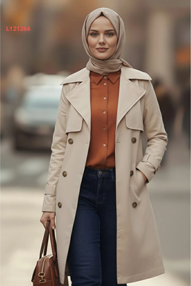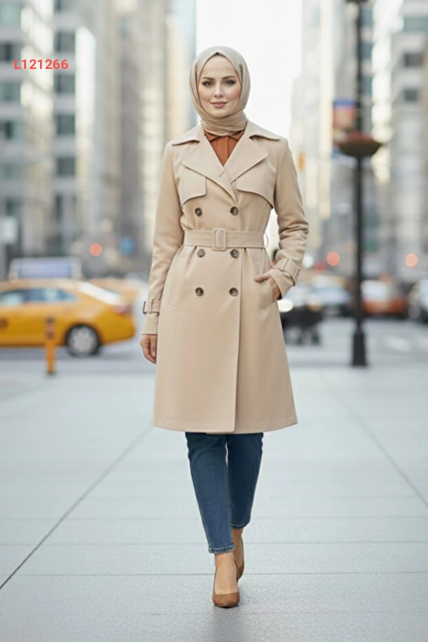 معطف ترينش نسائي بتصميم عصري من مجموعة زينيفا، لون حجر، 100% قطن، بطول 95 سم، مع بطانة وحزام