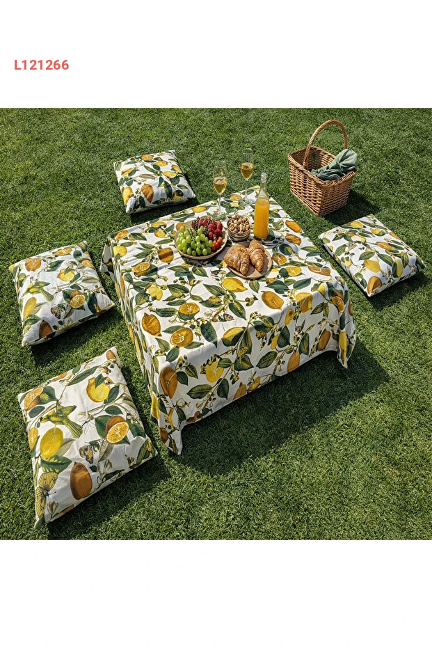 طقم نزهة مزين بالليمون مع غطاء طاولة ومساند 4 قطع - 170x170 سم