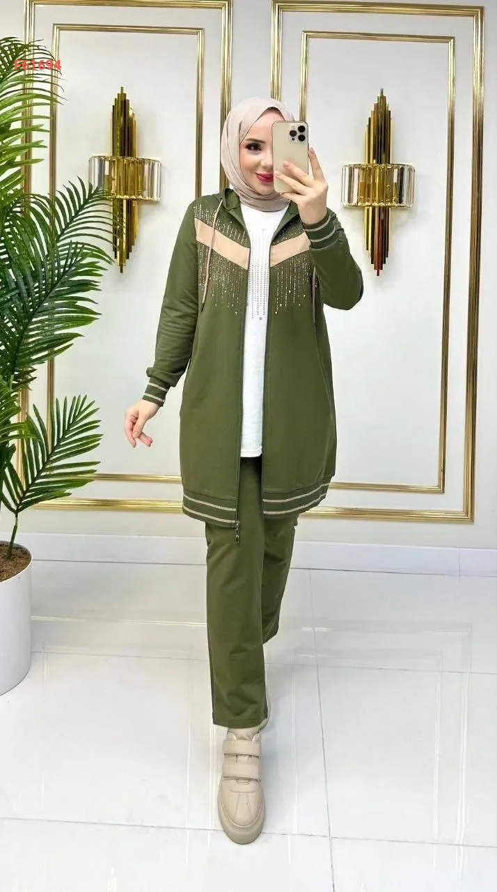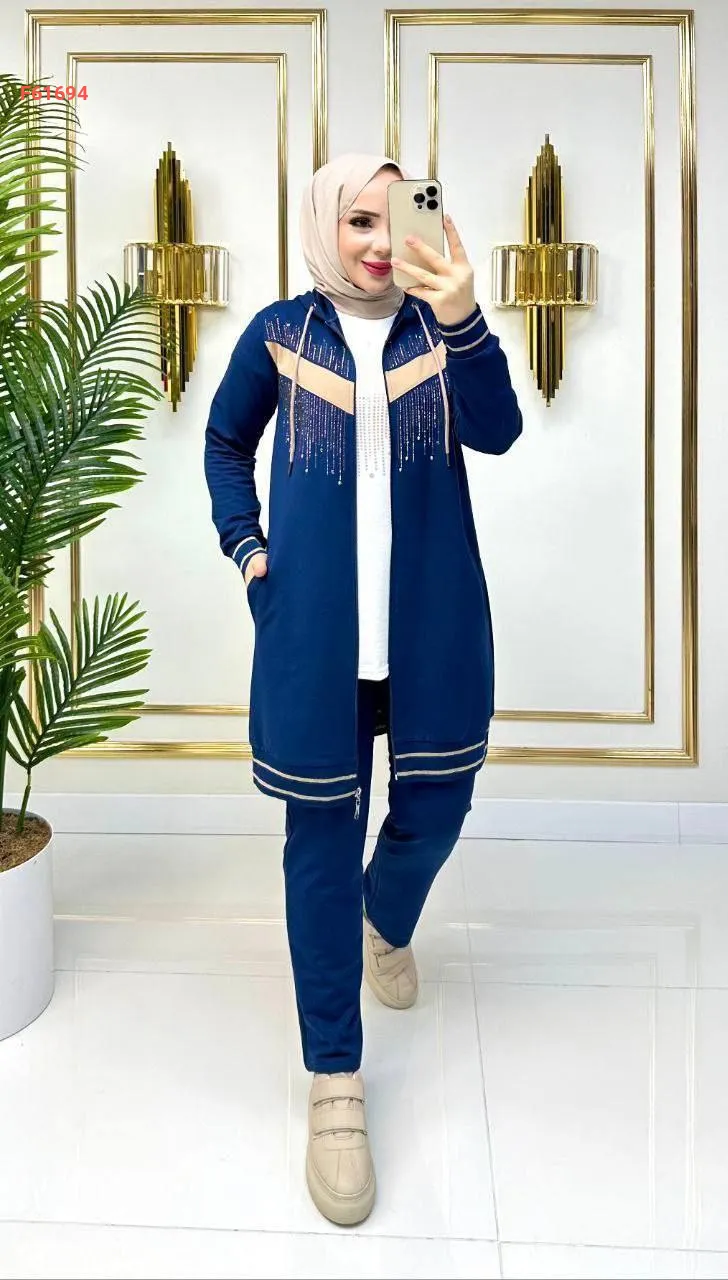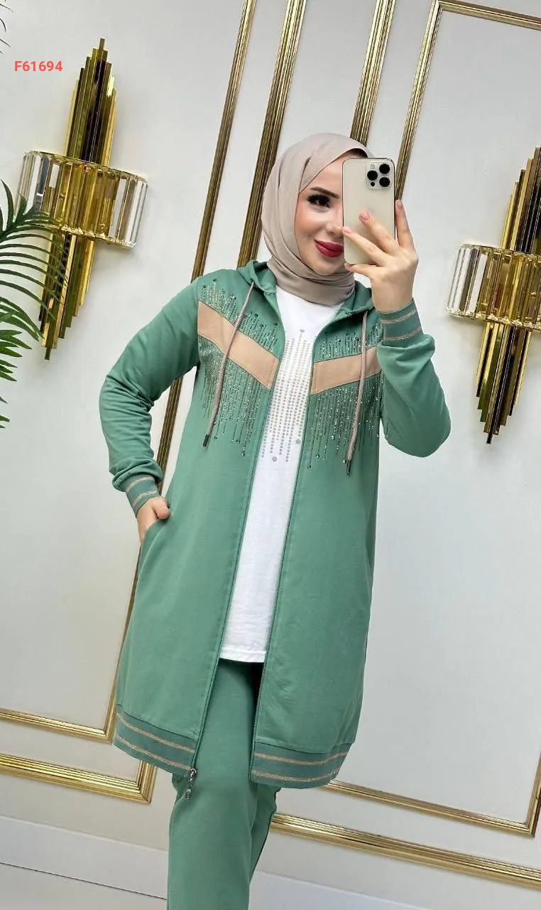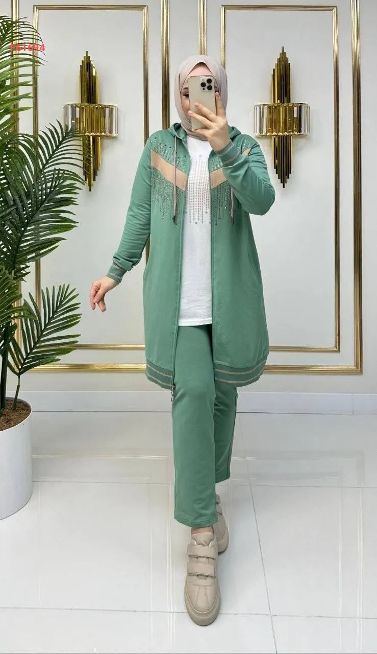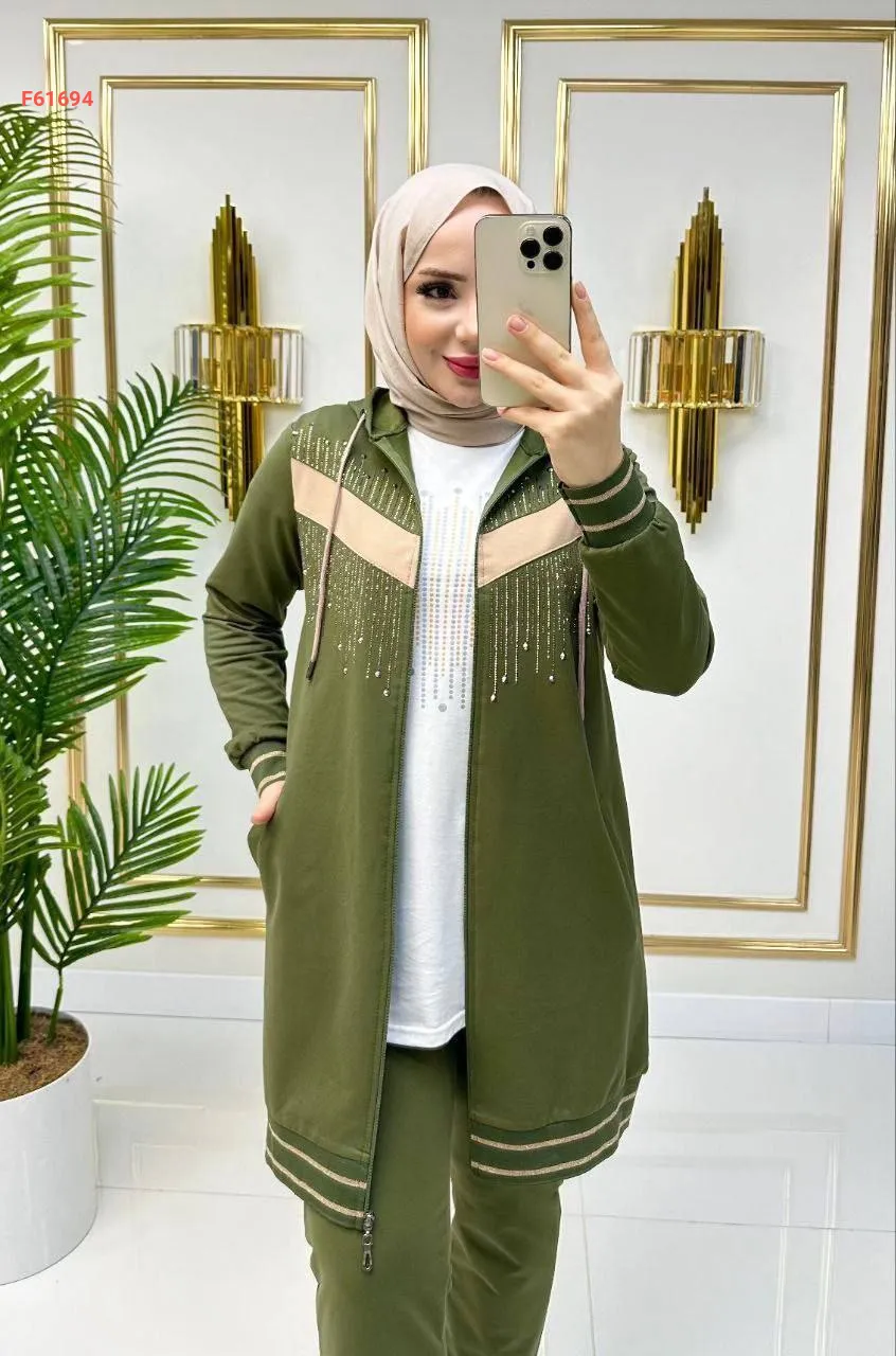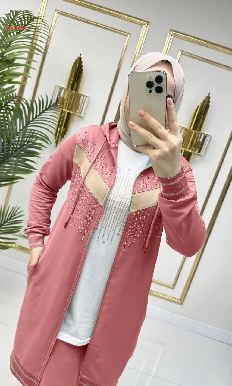 بيجامة بسحاب 3 قطع مرصعة بالألماس الناعم من الأمام