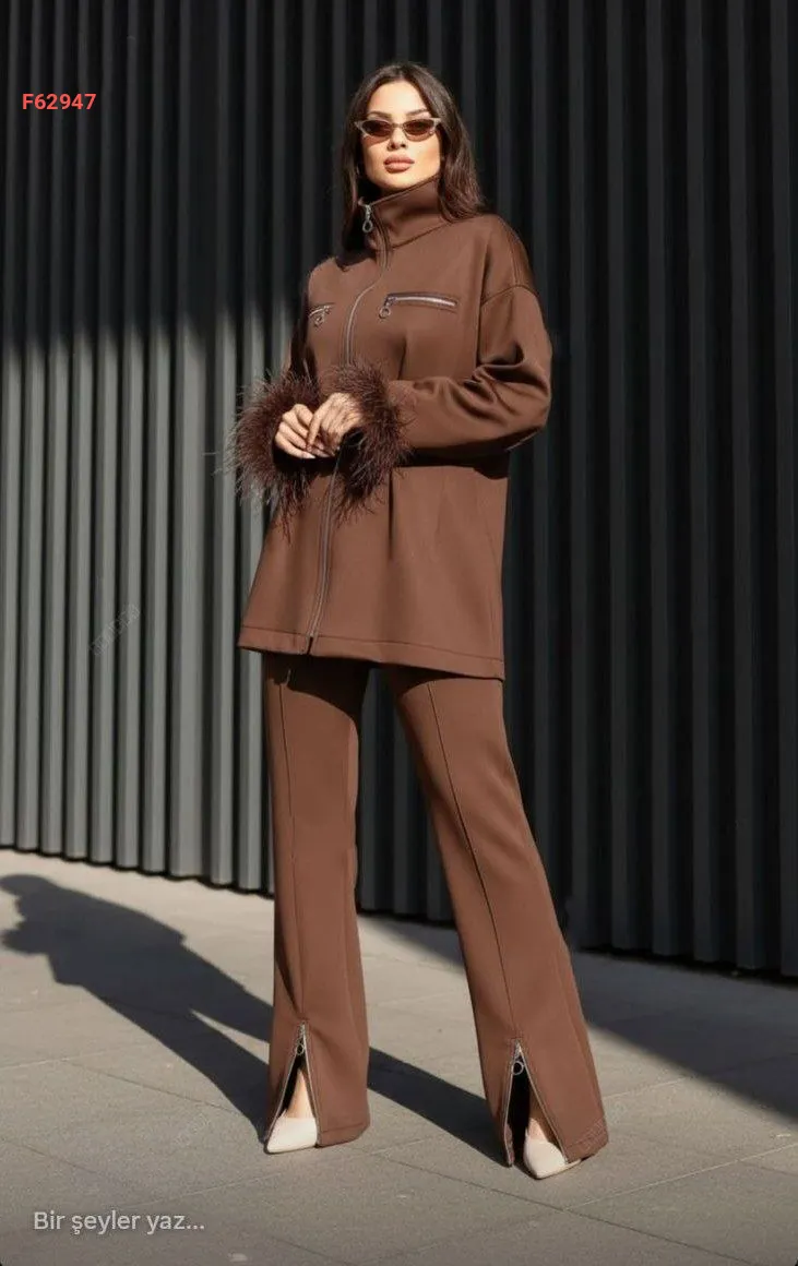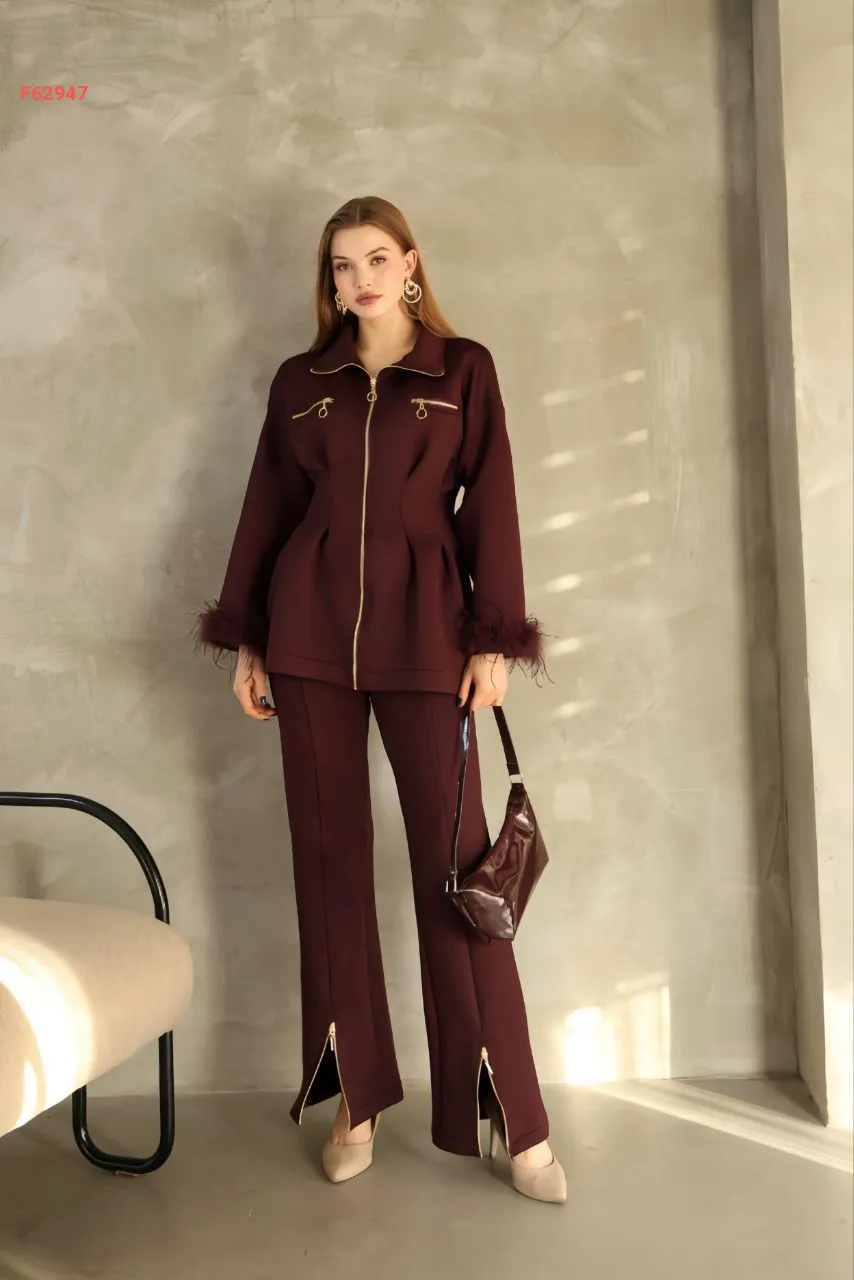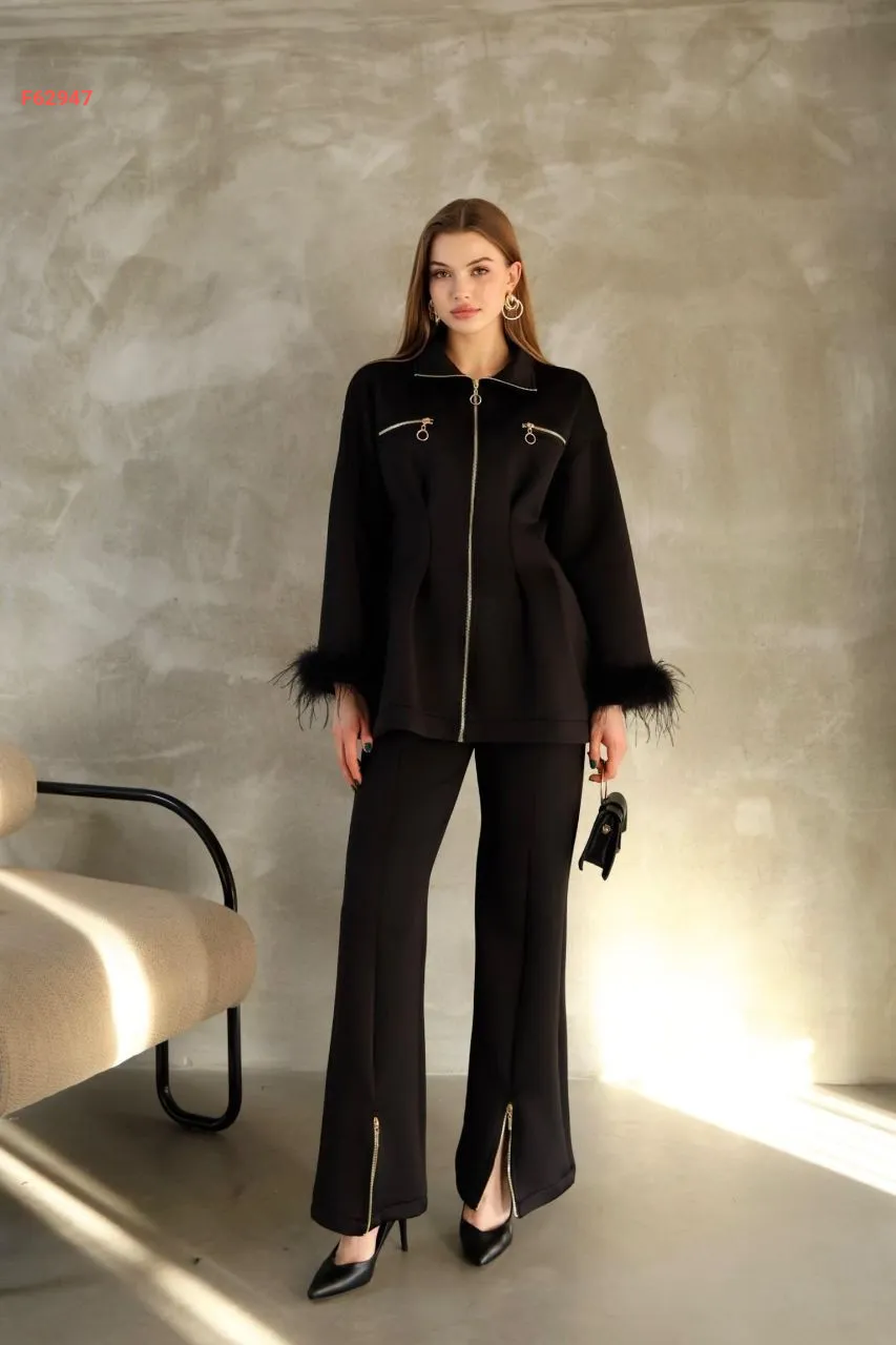 طقم جاكيت بسحاب ريش على الأكمام مع بنطال سحاب سفلي