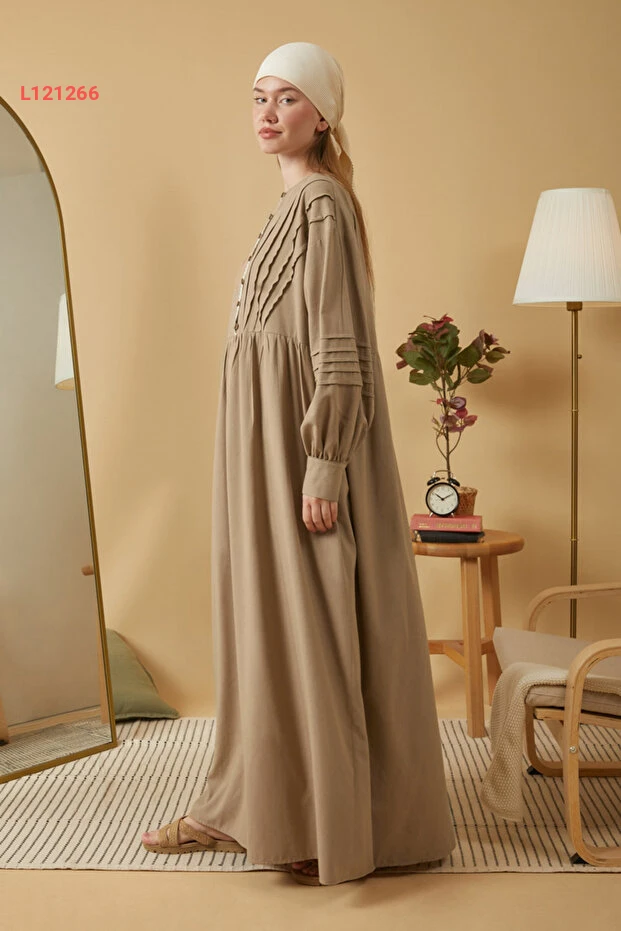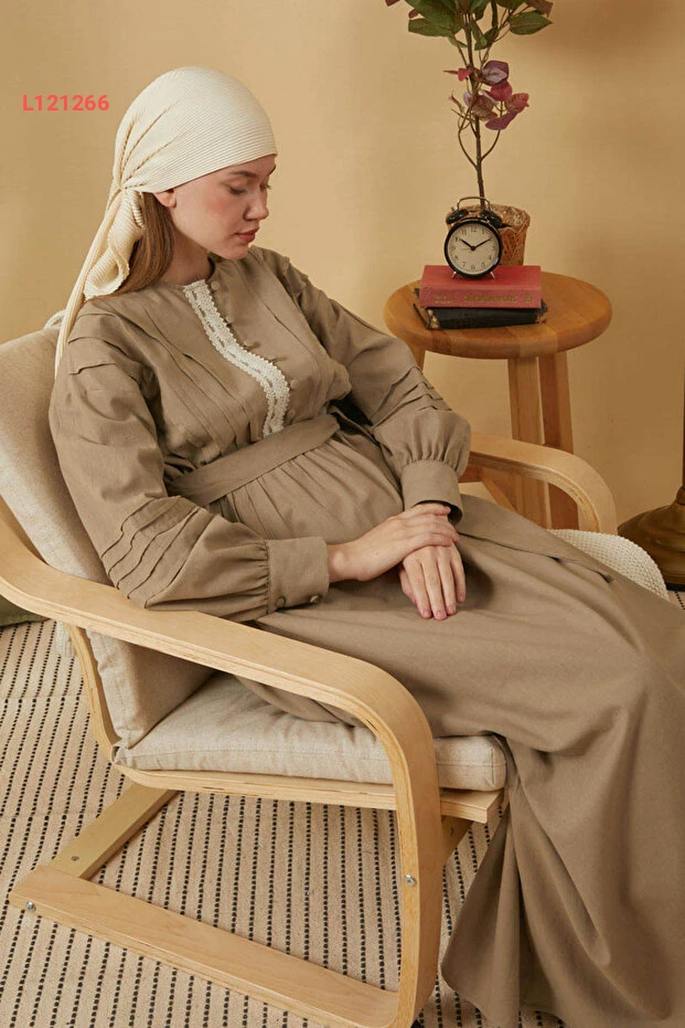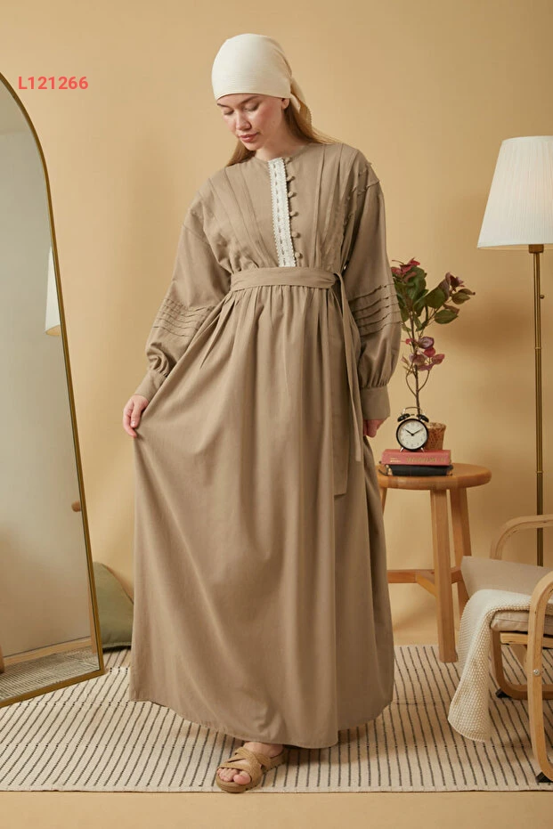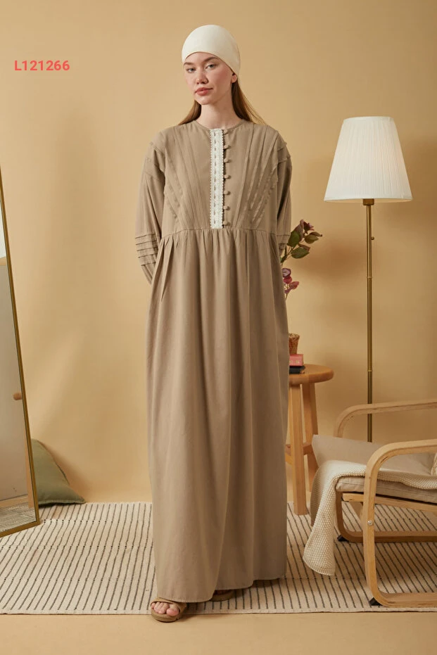 فستان بزة لعدة تفاصيل دانتيل بلون البيج