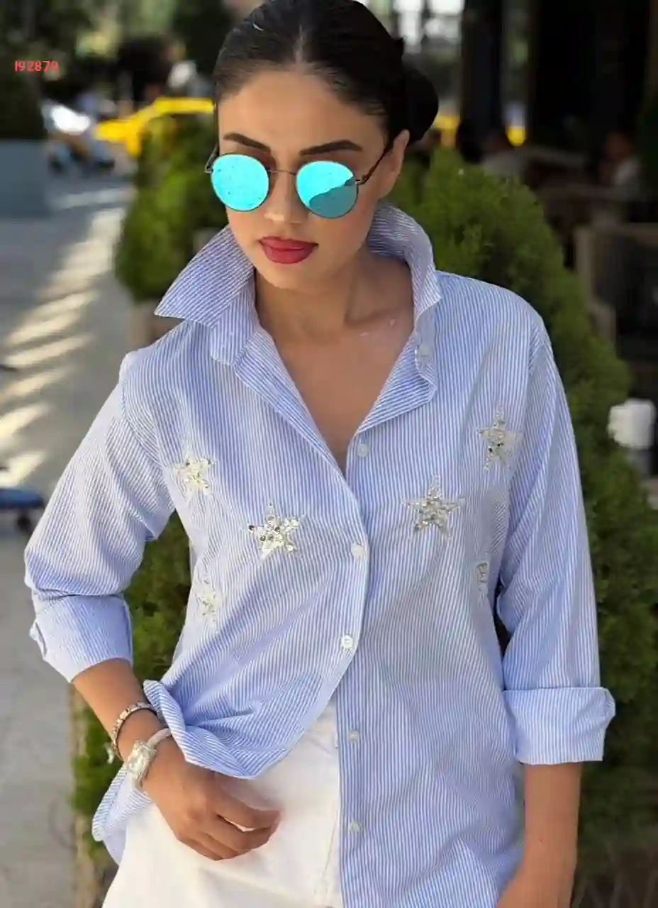 قميص مقلم مطرز بالترتر