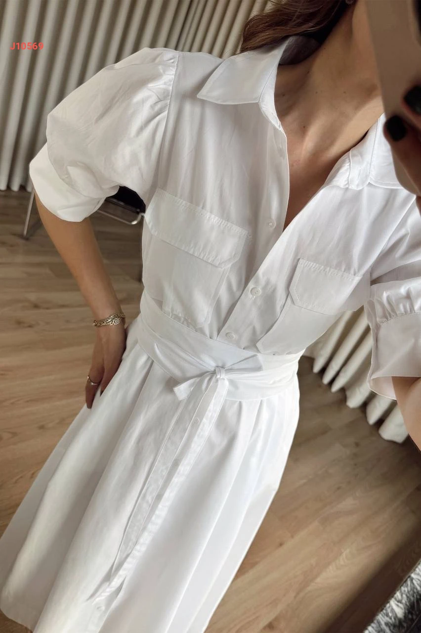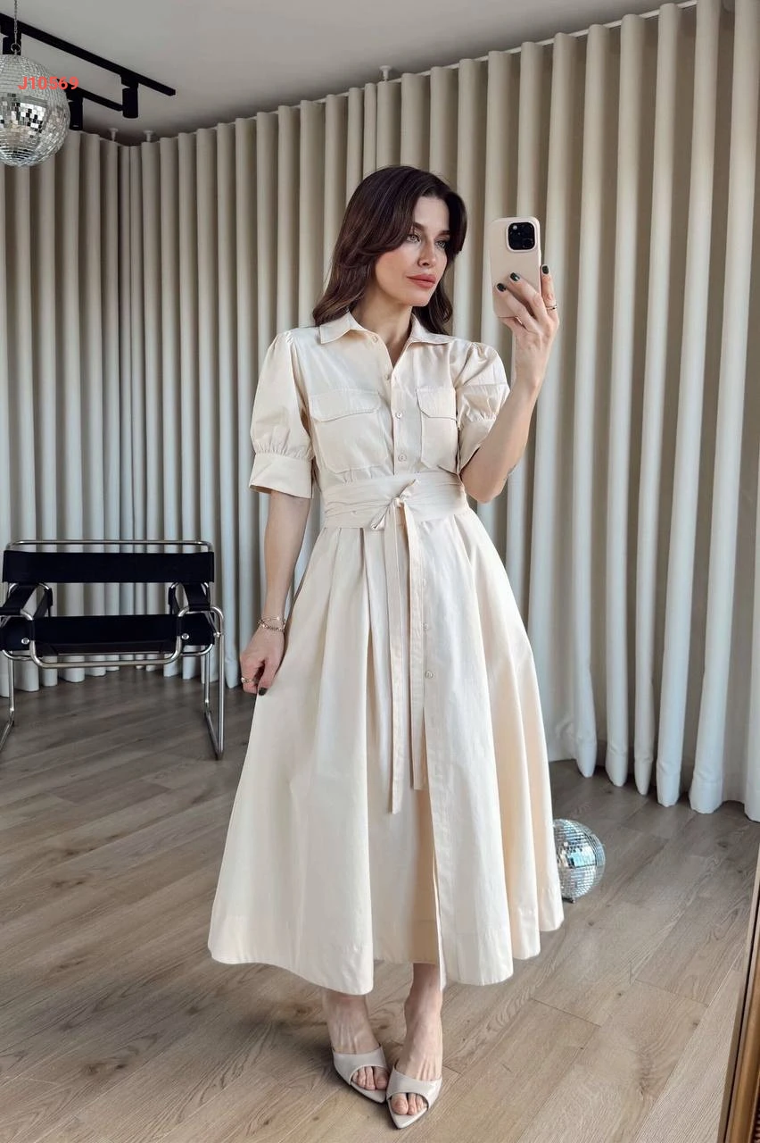 فستان طويل بأزرار وزنار عريض