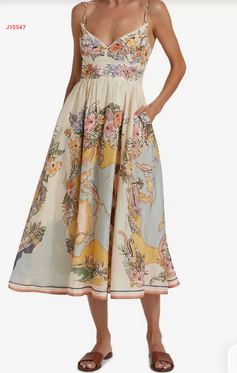 فستان كتان منقوش بحمالات رفيعة