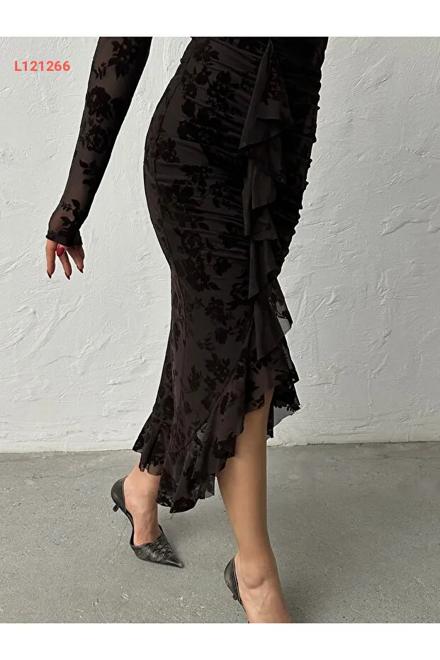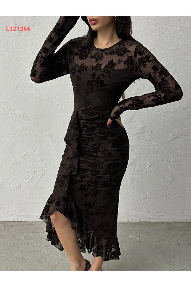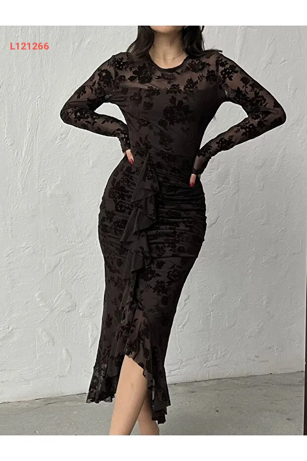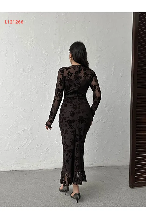 فستان طويل ذو ياقة دائرية مزين بطبعة مخملية مع أزرار خلفية وتفاصيل من الورد