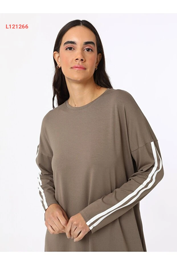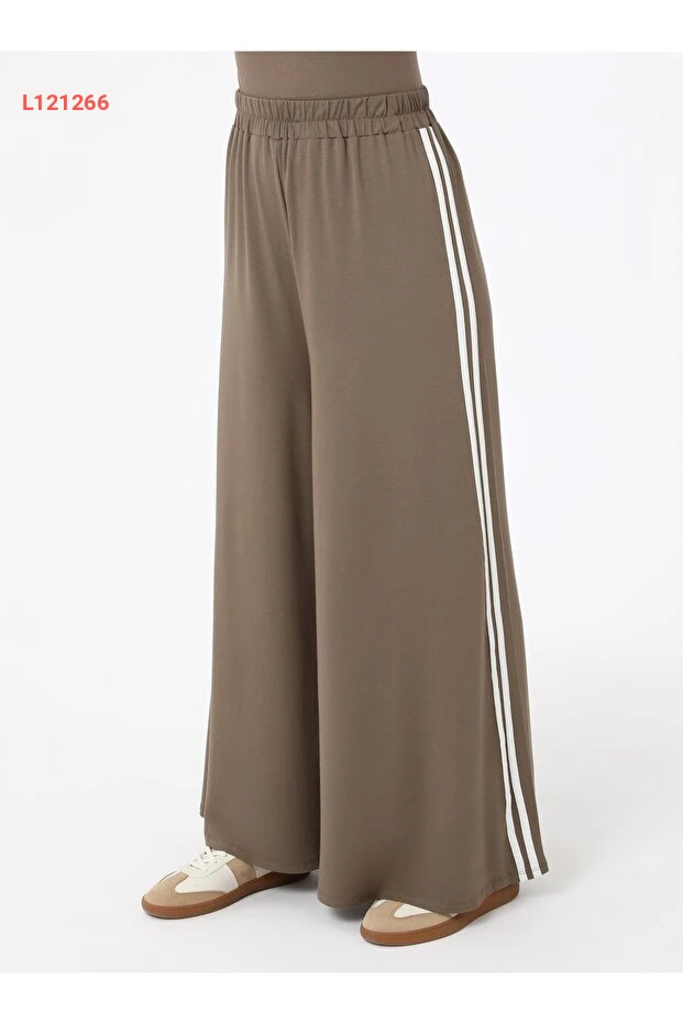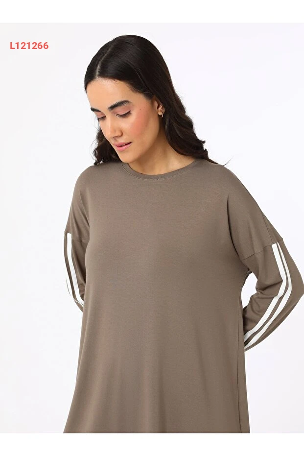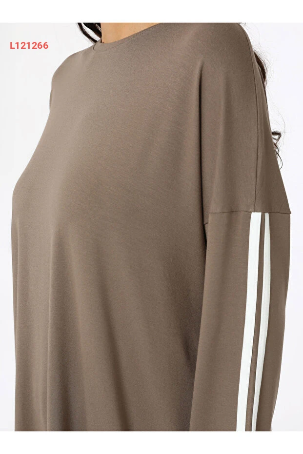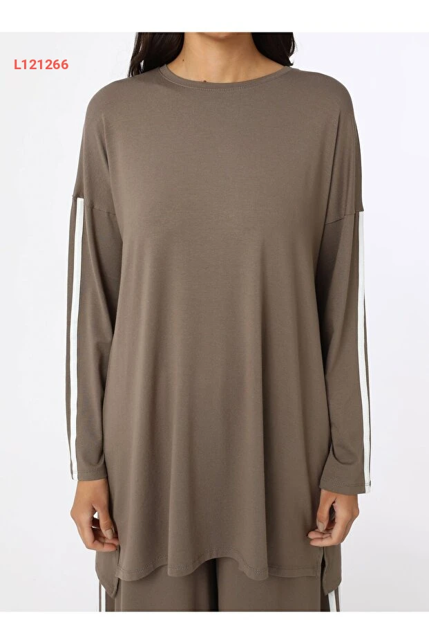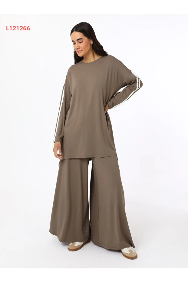 مجموعة تونيك وبنطلون فيسكون بتفاصيل شريط - لون البيج