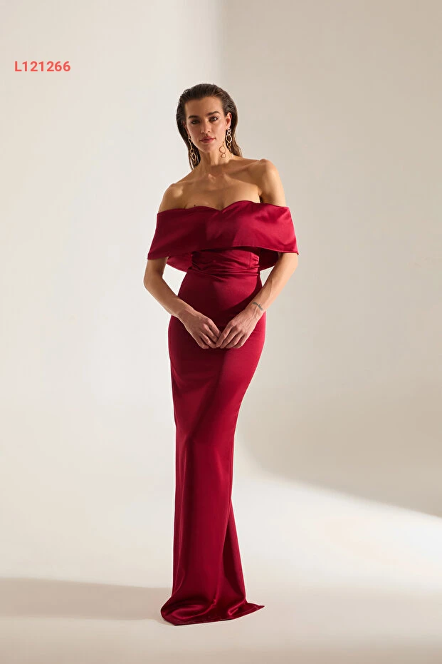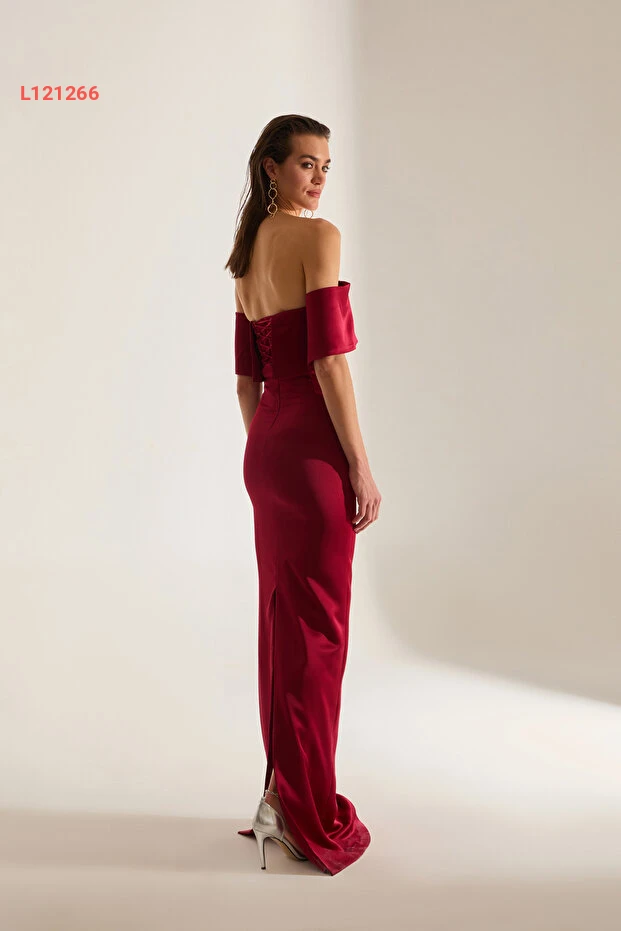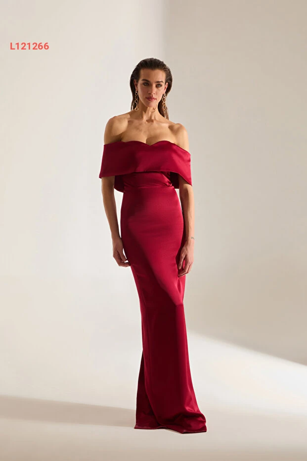 فستان خطوبة ساتان بكم مدونة بربري - أحمر داكن