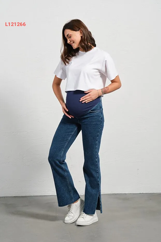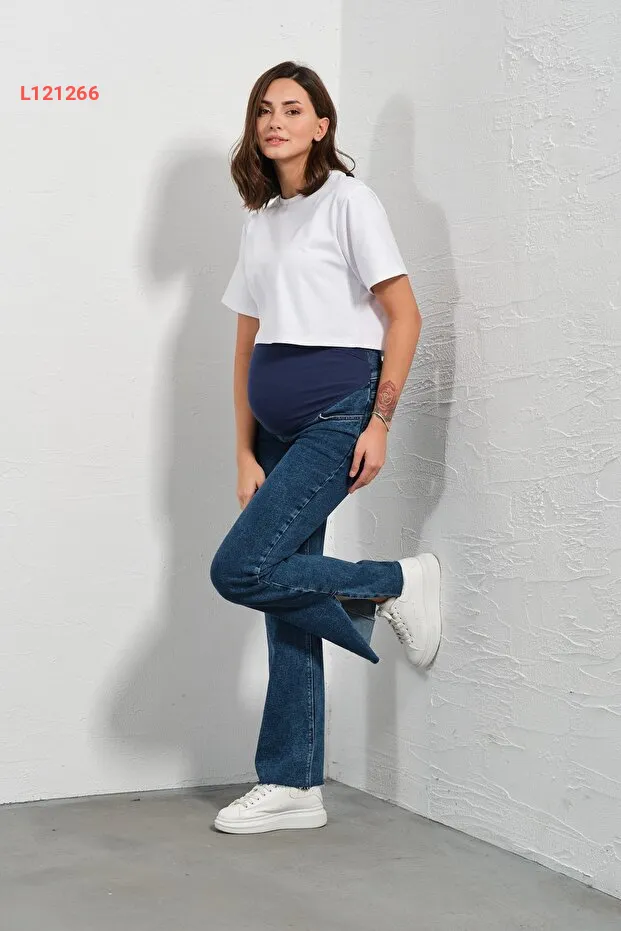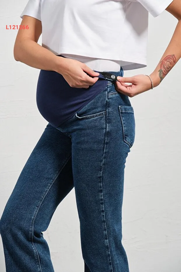 بنطال جينز مرن وقابل للتعديل للحوامل بأرجل واسعة - أزرق