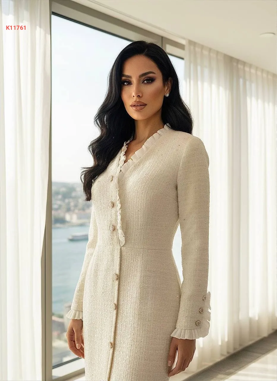 فستان شانيل مطرز بالترتر بأزرار