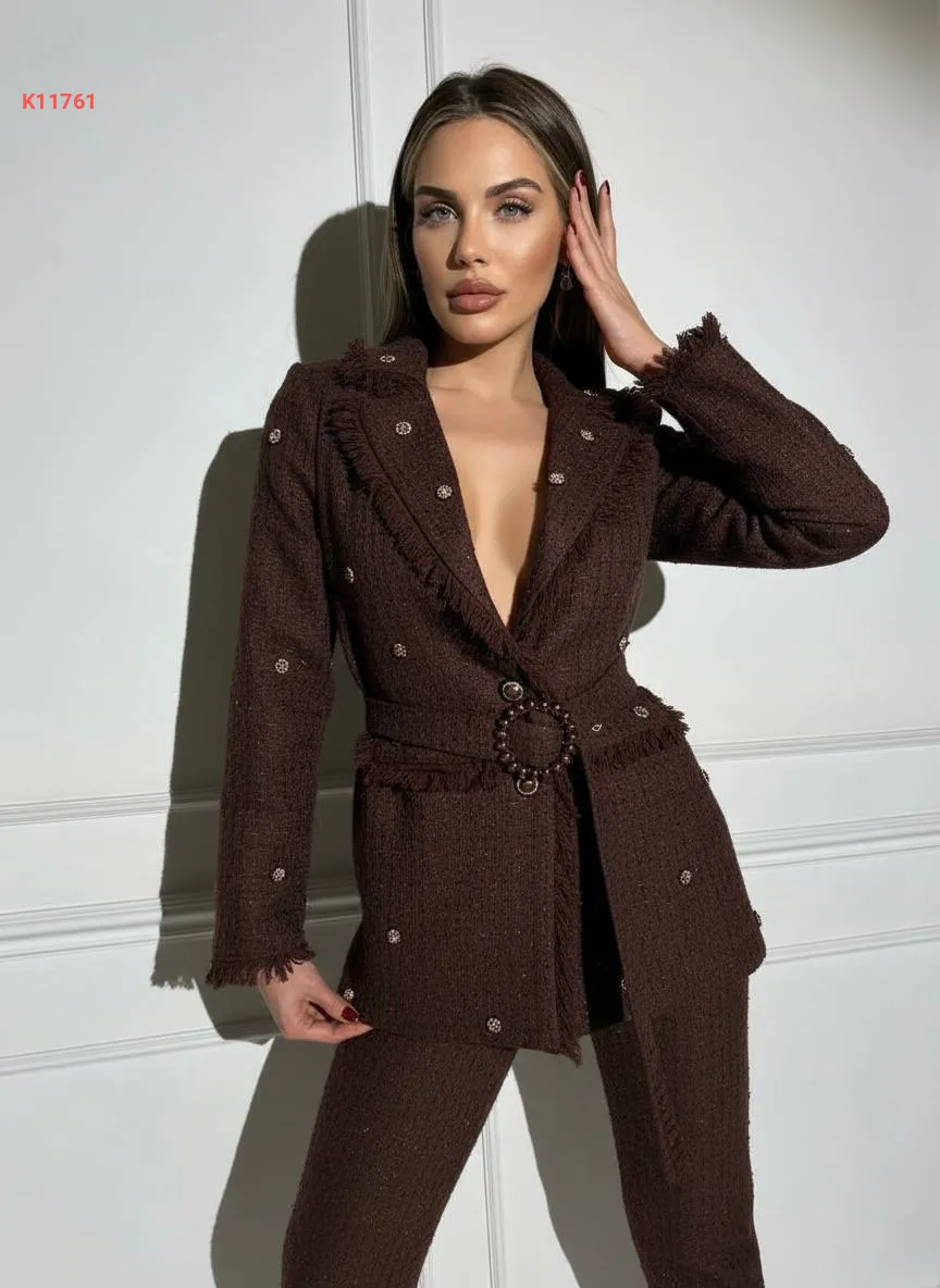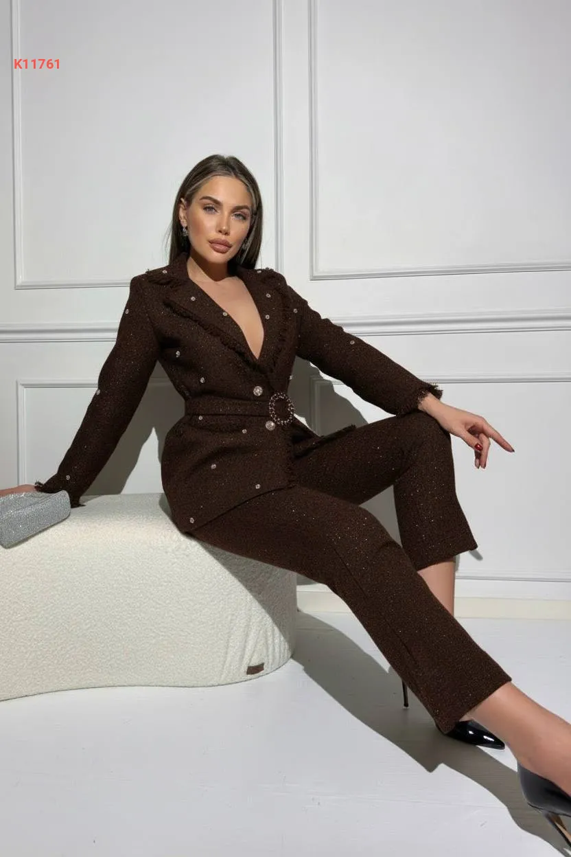 طقم بنطال شانيل مع جاكيت بأحجار ولولو