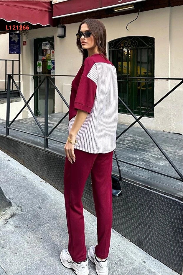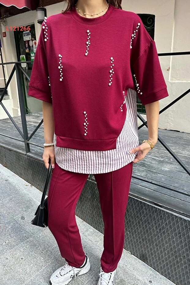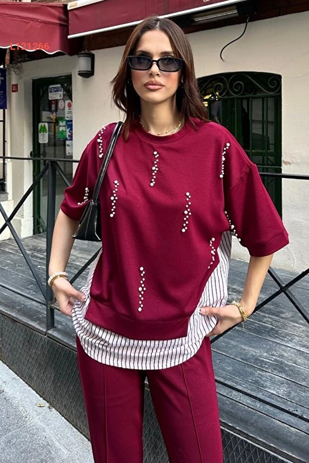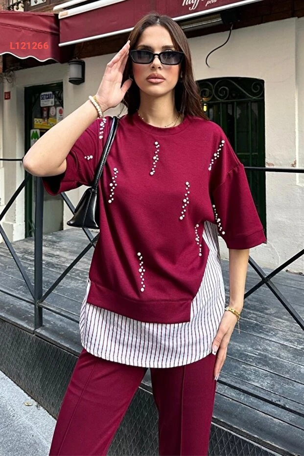طقم توب كاجوال من القطن بنقشة الخطوط وبيزات اللؤلؤ للنساء