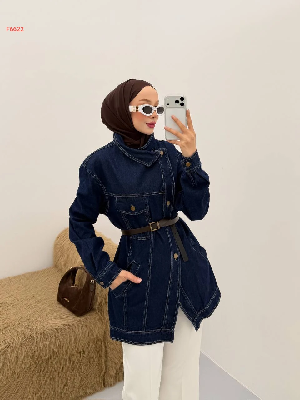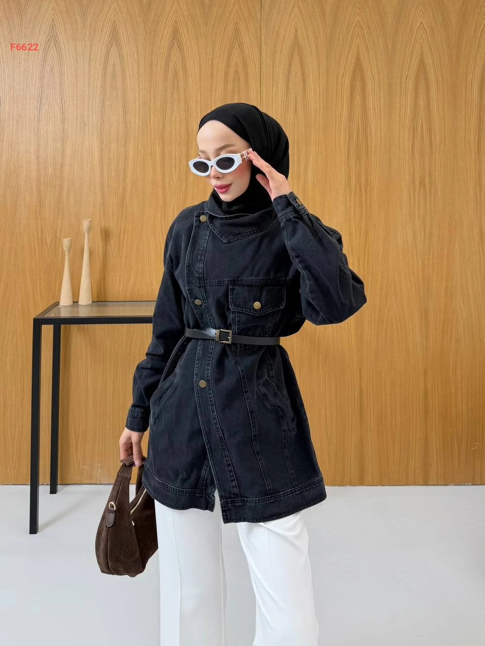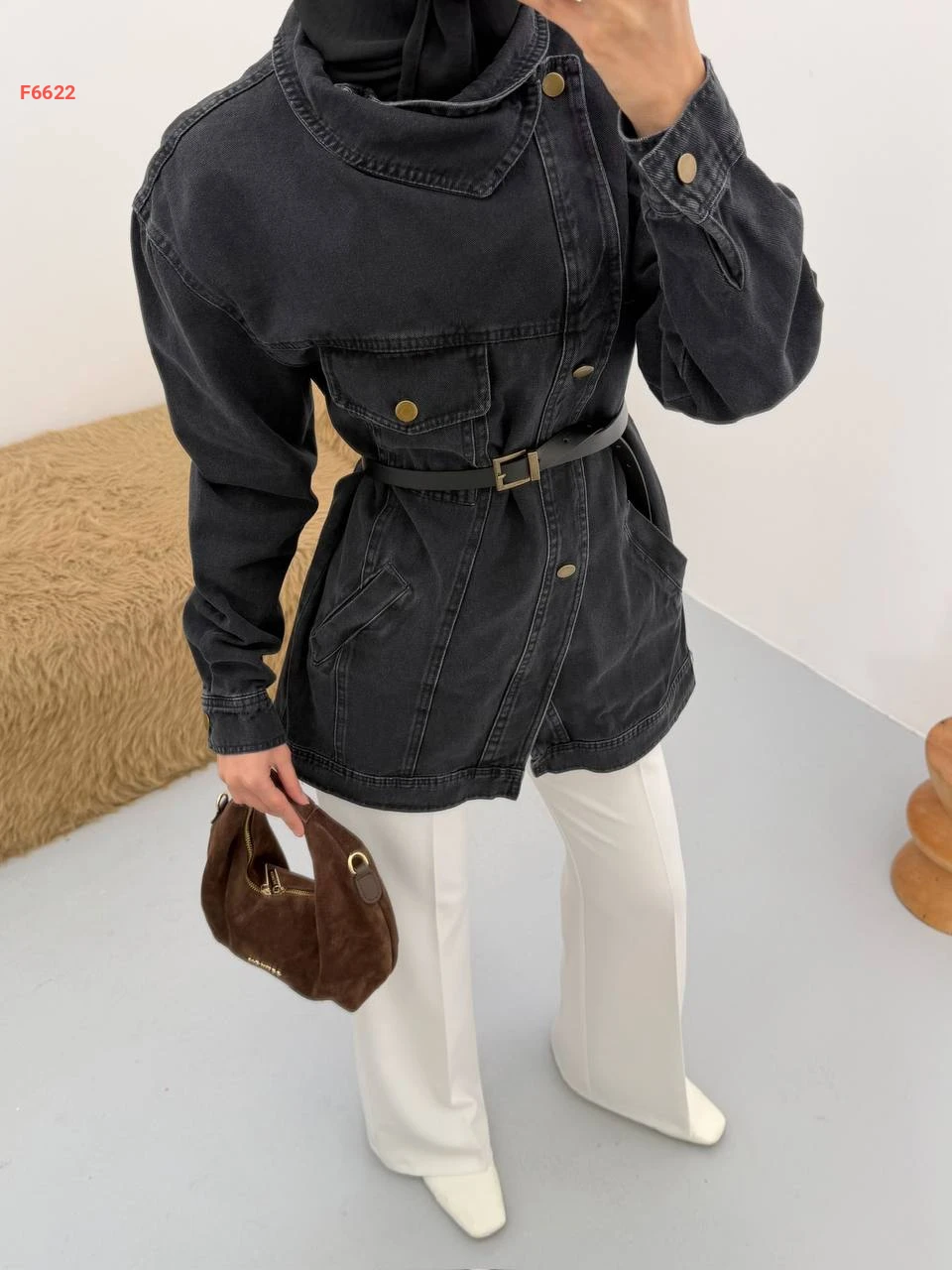 جاكيت جينز لف بأزرار جانبية وحزام