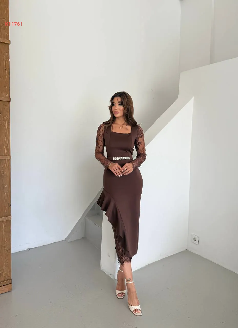 فستان بأكمام دانتيل وأحجار ستراس عالخصر