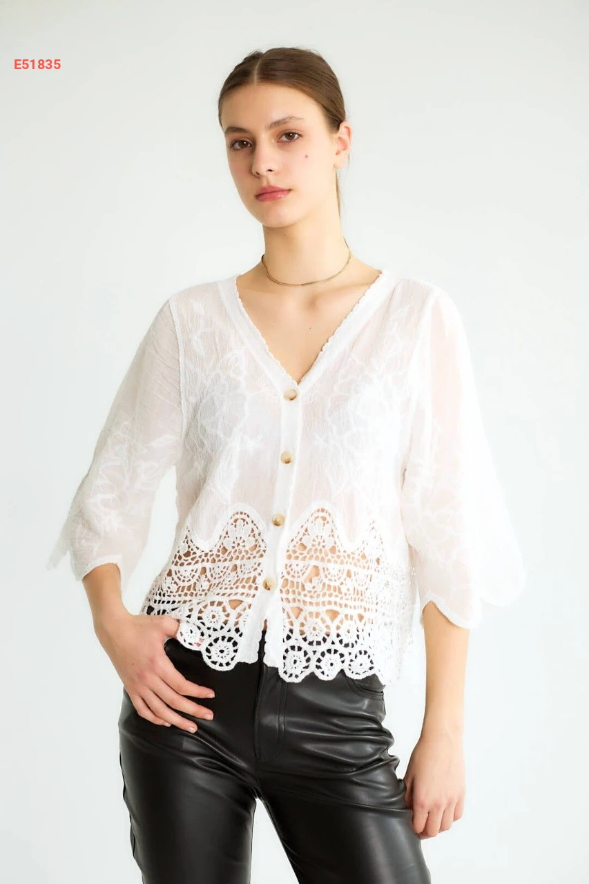 بلوزة مطرزة بأزرار مع تفاصيل مفرغة