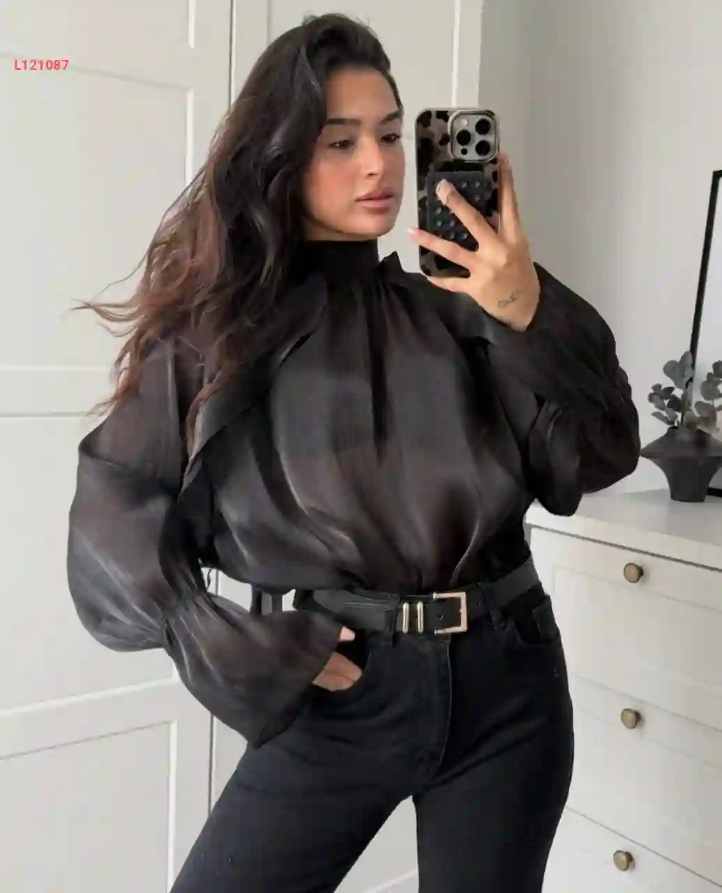 بلوزة كم طويل مجمعة بإبزيم