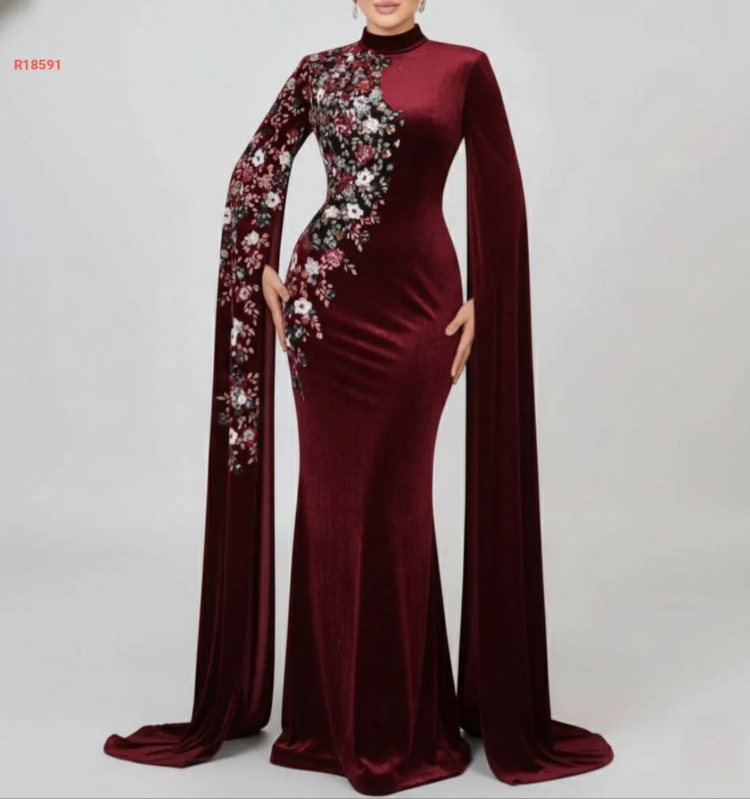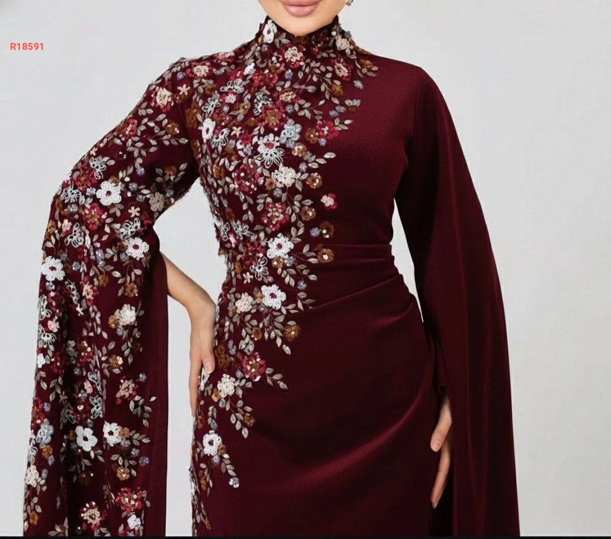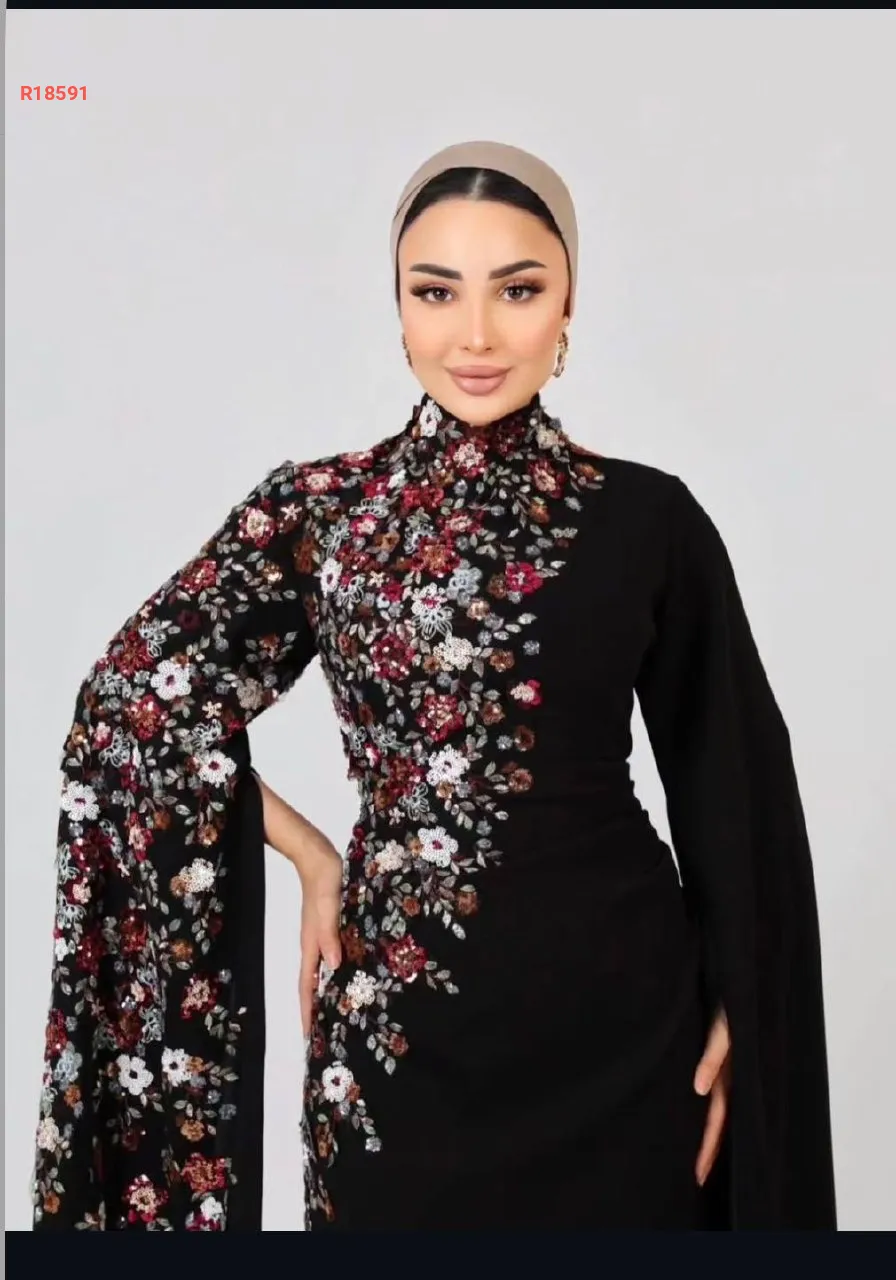 فستان محتشم أنيق بلون الأسود الكلاسيكي، مطرّز بالكامل بزهور راقية تضيف لمسة فنية ساحرة.