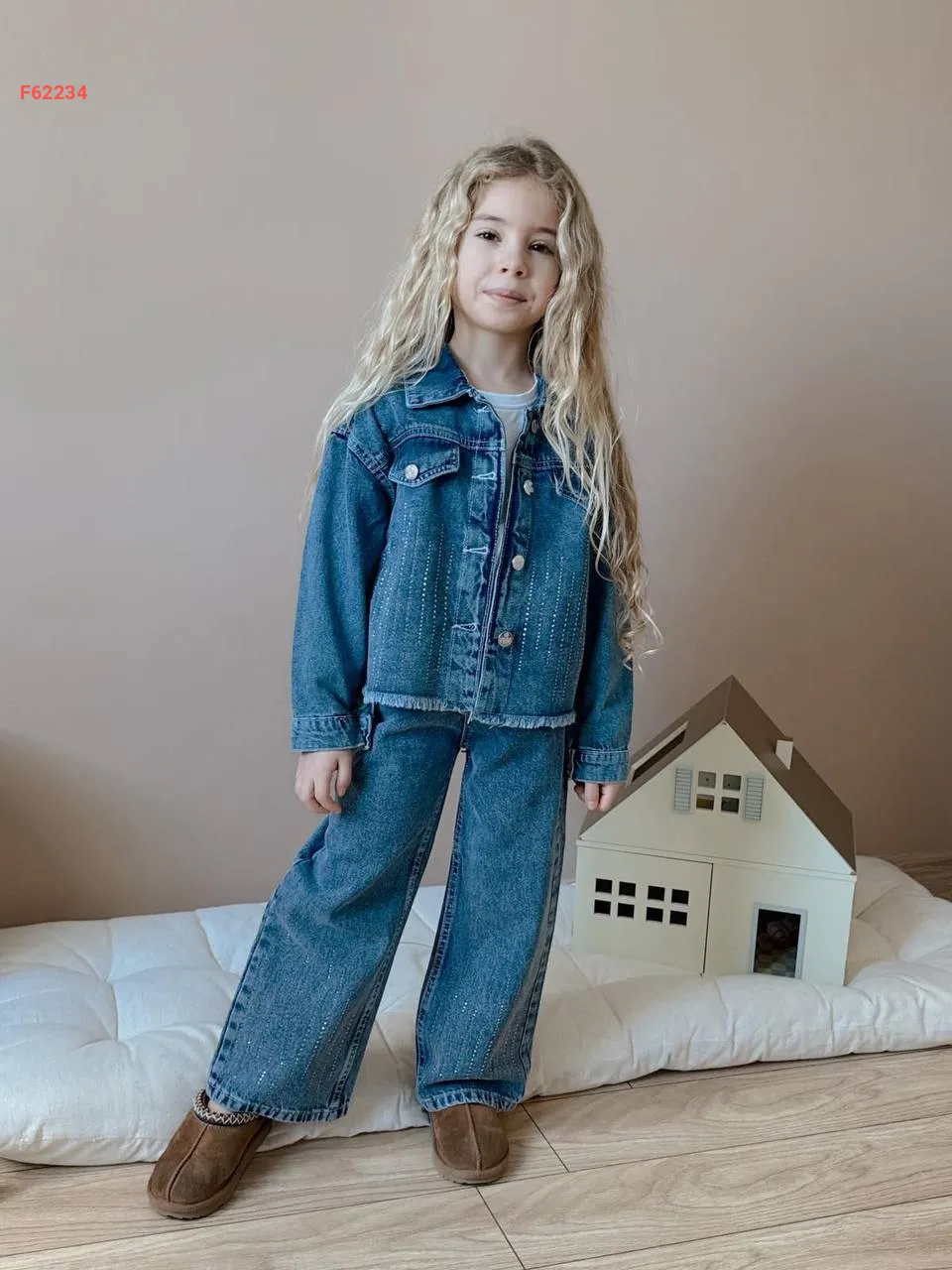 طقم بنطال جينز بناتي بتفاصيل حجرية