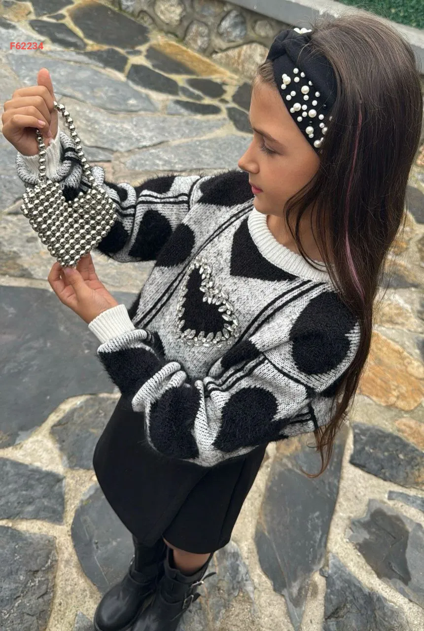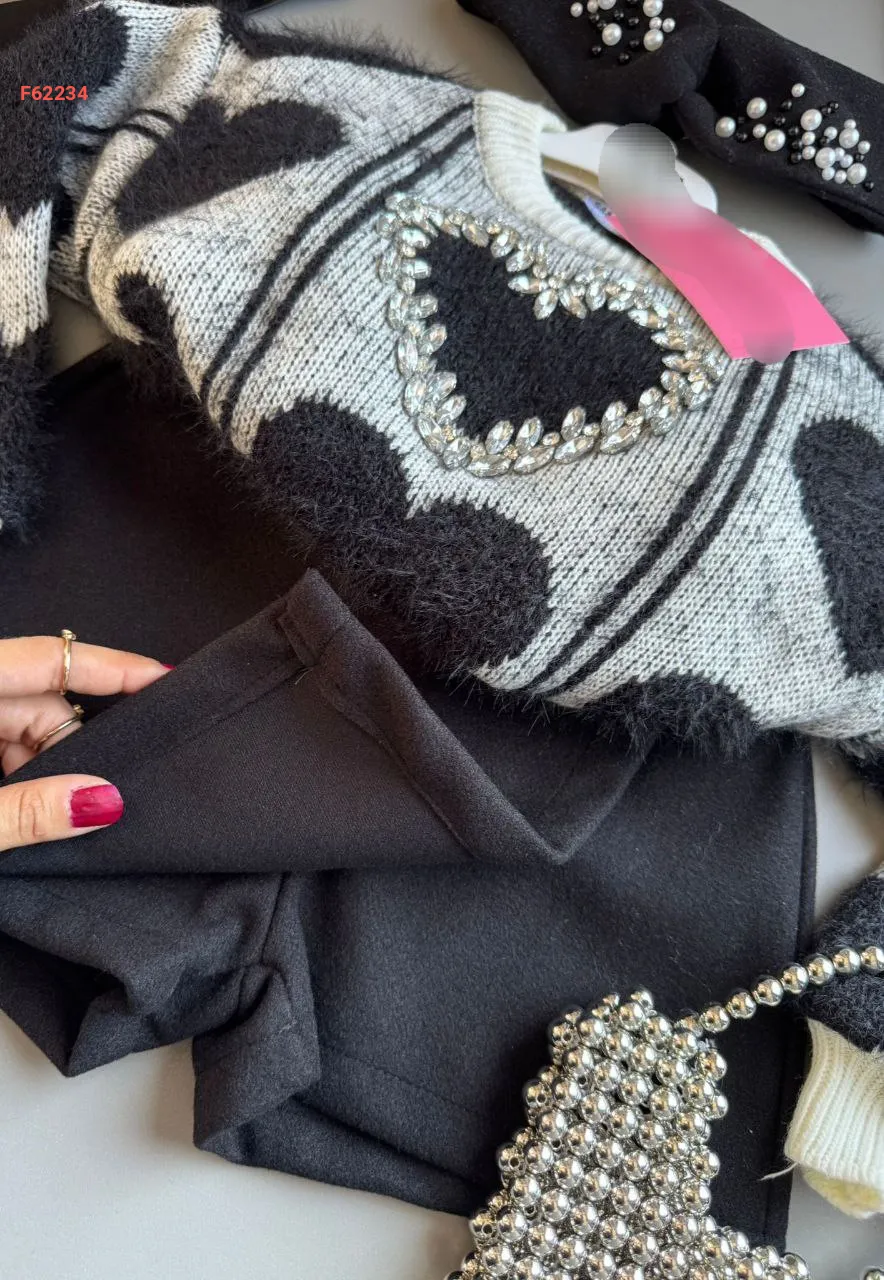 طقم تنورة بناتي مع كنزة تريكو وحقيبة