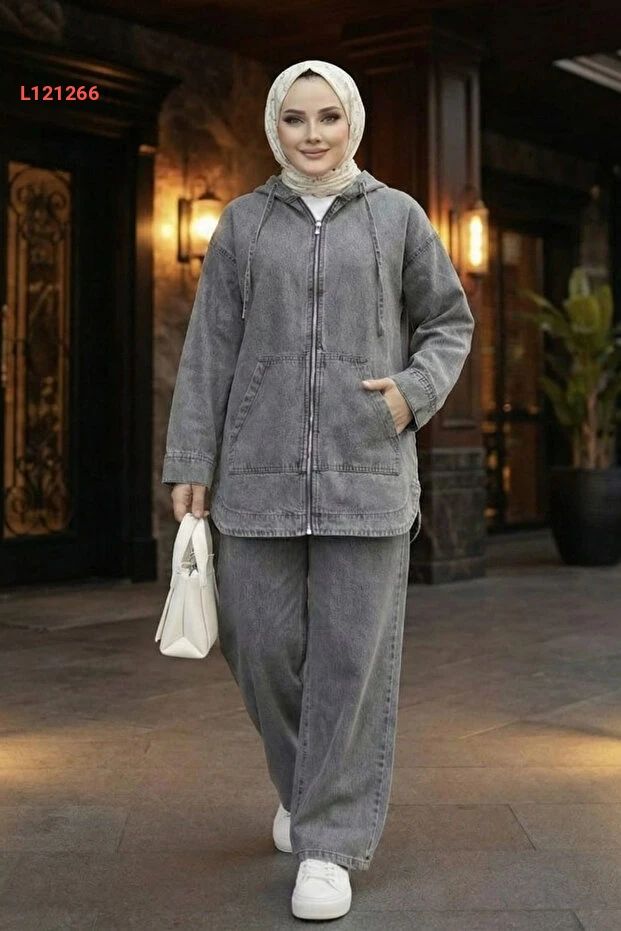 طقم تونك وبنطلون جينز رمادي داكن بغطاء رأس و جيوب للنساء من هب هارما