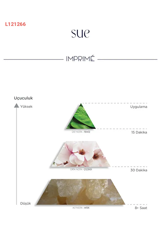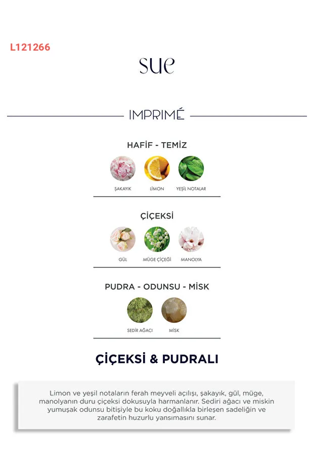 استمتع بتجربة عطرية فريدة مع عطر Imprime Sue EDP للنساء بحجم 50 مل. يجمع هذا العطر بين نفحات الأزهار الرقيقة مثل الشايك والليمون، مع لمسة من الورد والمغنوليا، مما يمنحك شعورًا بالانتعاش والأنوثة. تضفي قاعدة المسك لمسة مميزة تدوم طويلاً، مما يجعله الخيار المثالي لترك انطباع لا يُنسى في كل مناسبة.