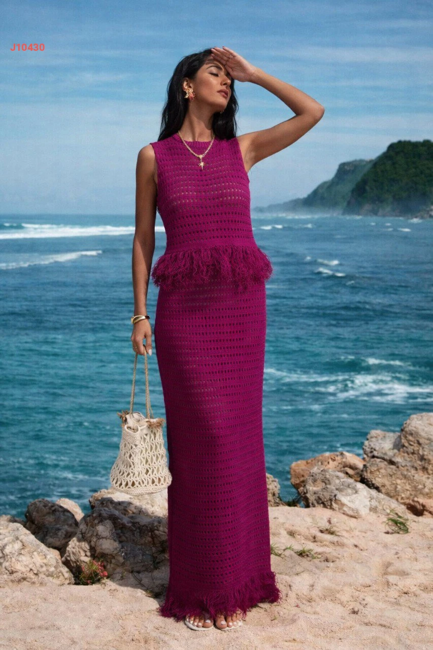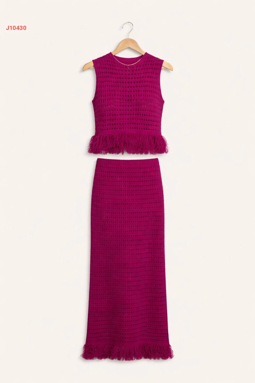 طقم تنورة تريكو مفرغ بشراشيب