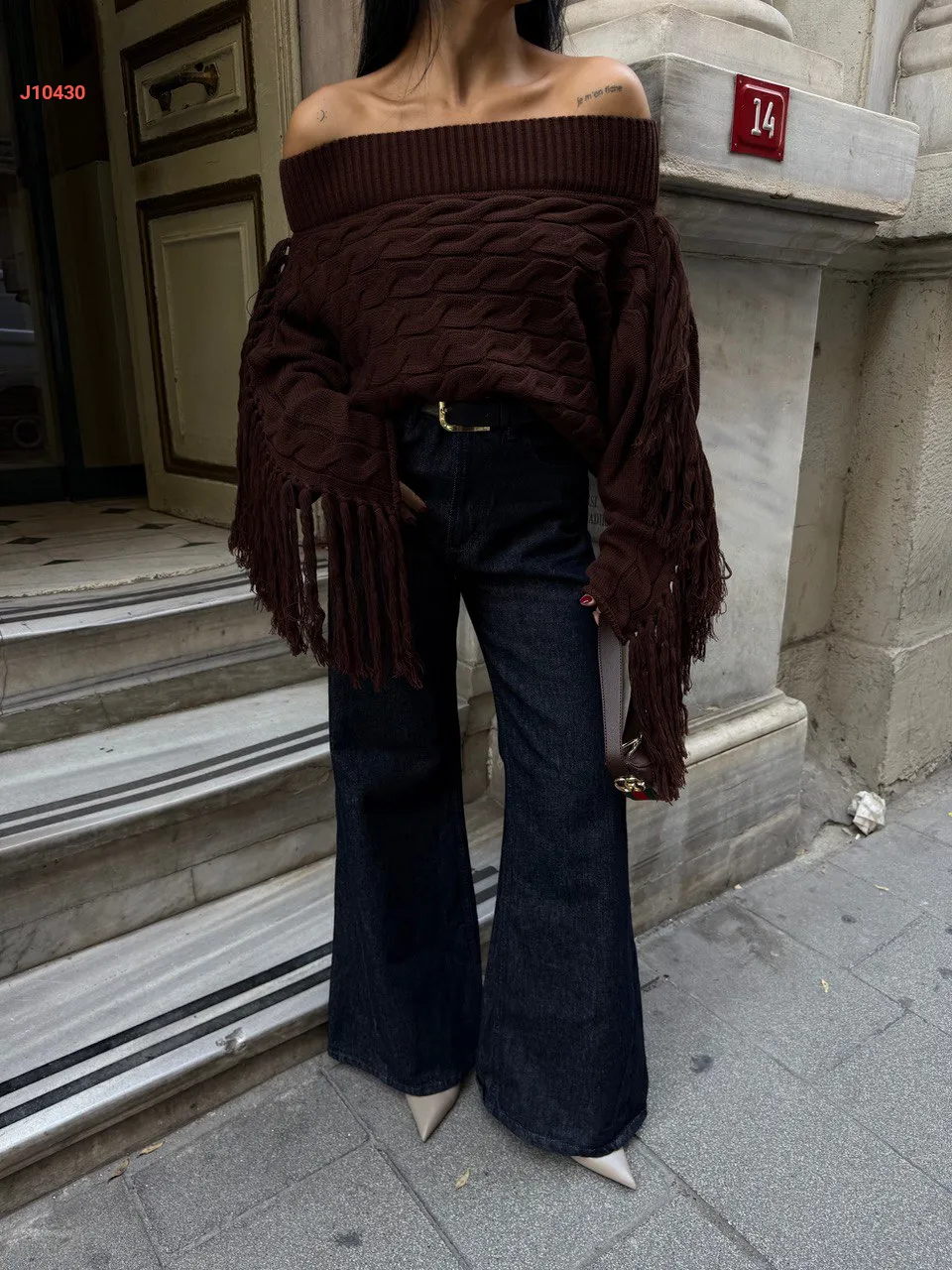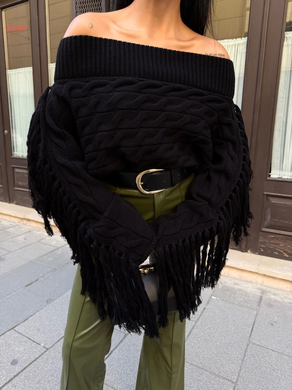 كنزة تريكو مجدولة بشراشيب عالأكمام