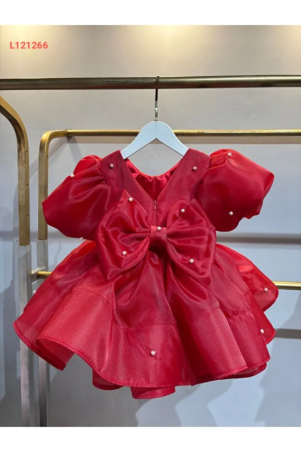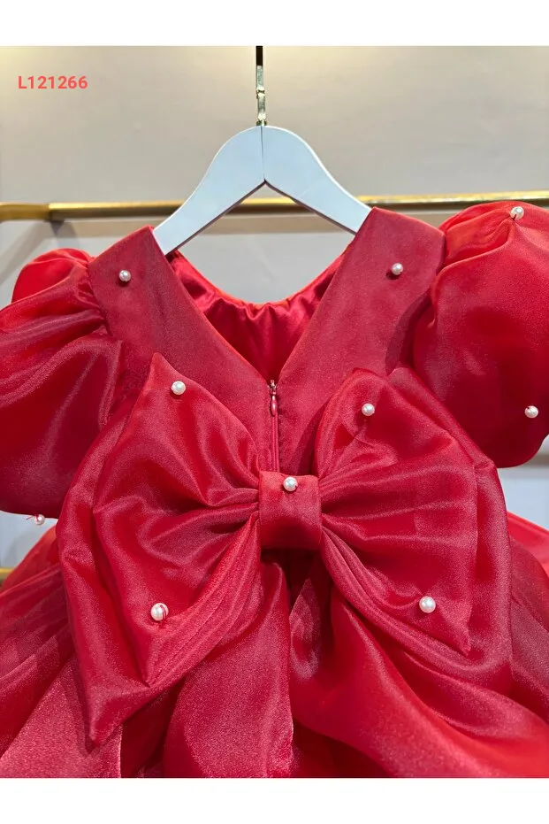 فستان حفلة للأميرة الصغيرة بأكمام بالون مزينة باللآلئ مع حزام