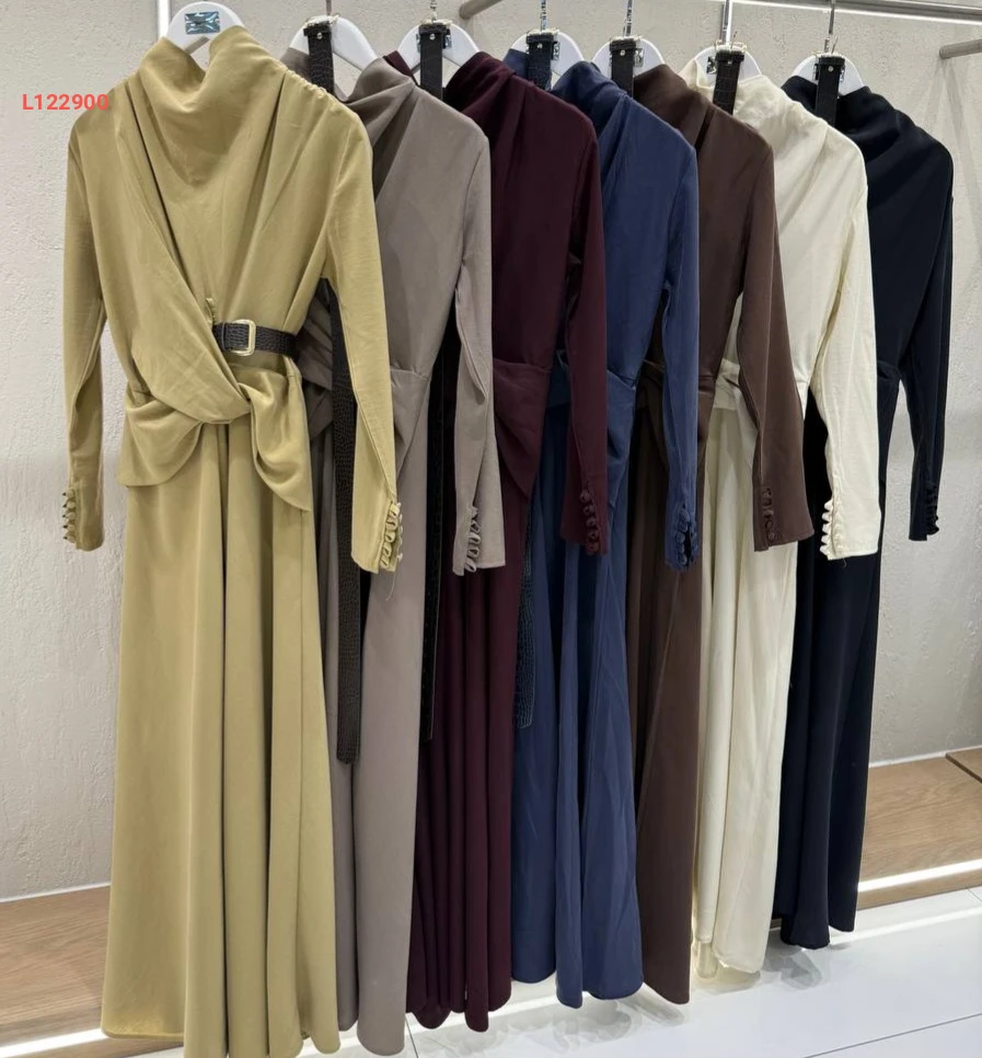 فستان طويل بحزام وأزرار عالكم