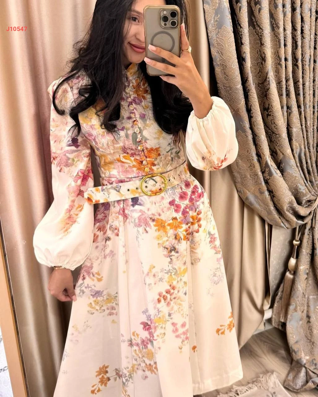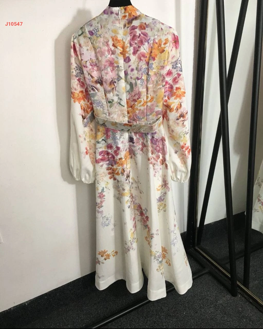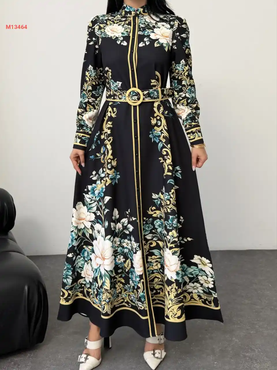فستان طويل منقوش ورد مع حزام