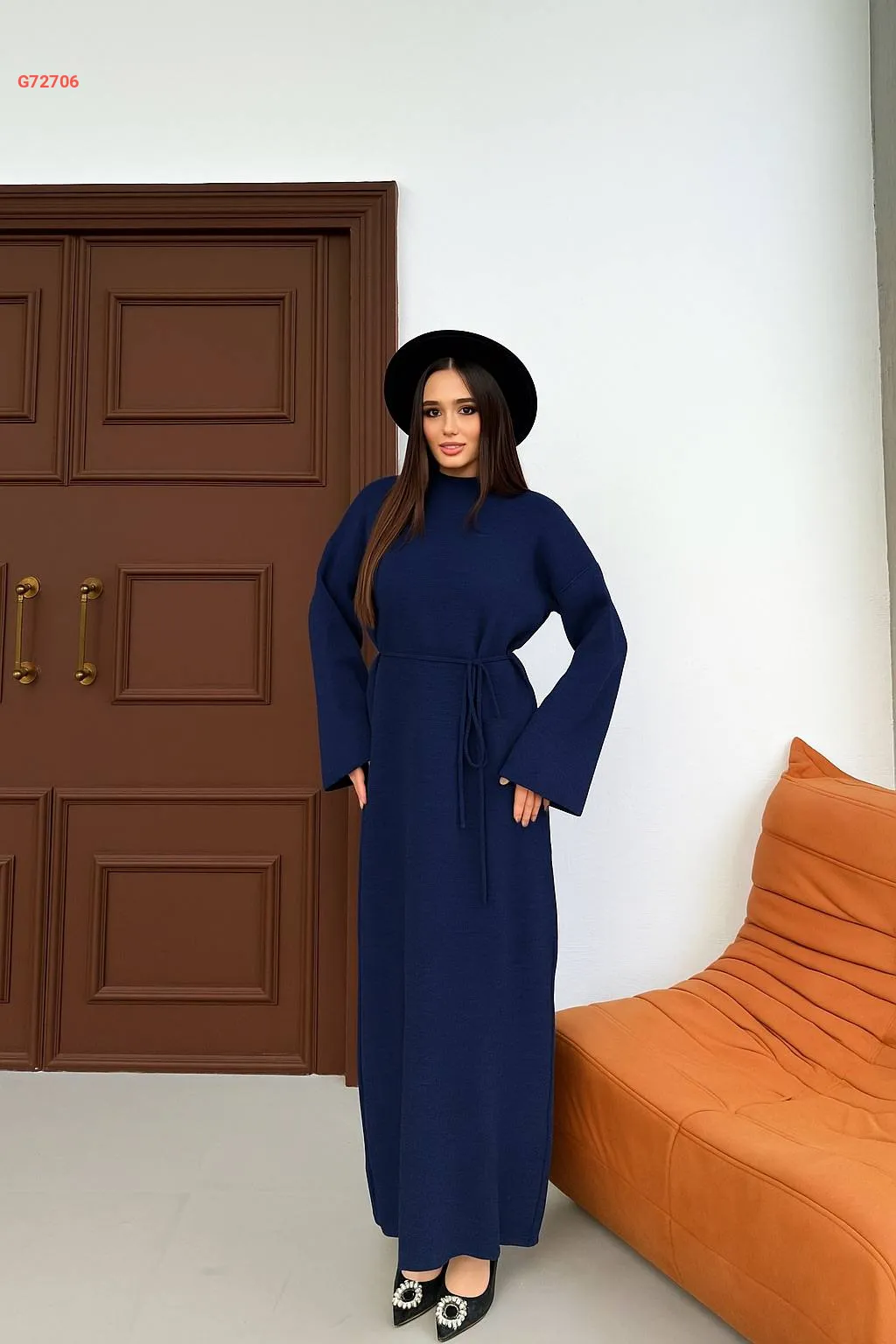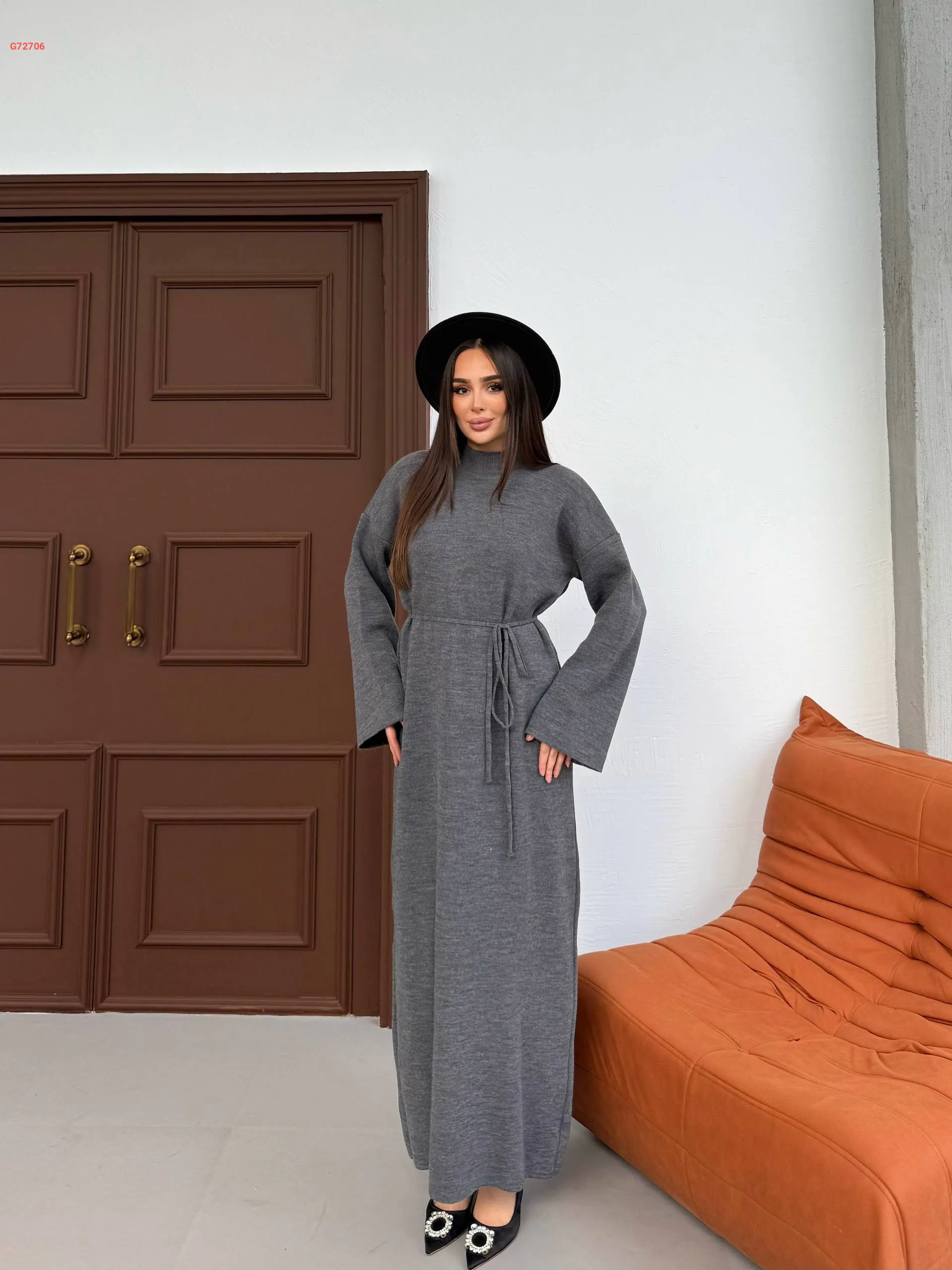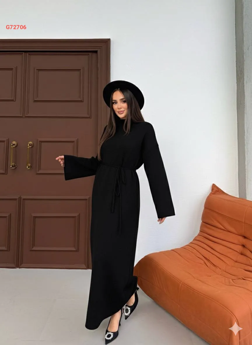 فستان تريكو طويل بزنار ربط