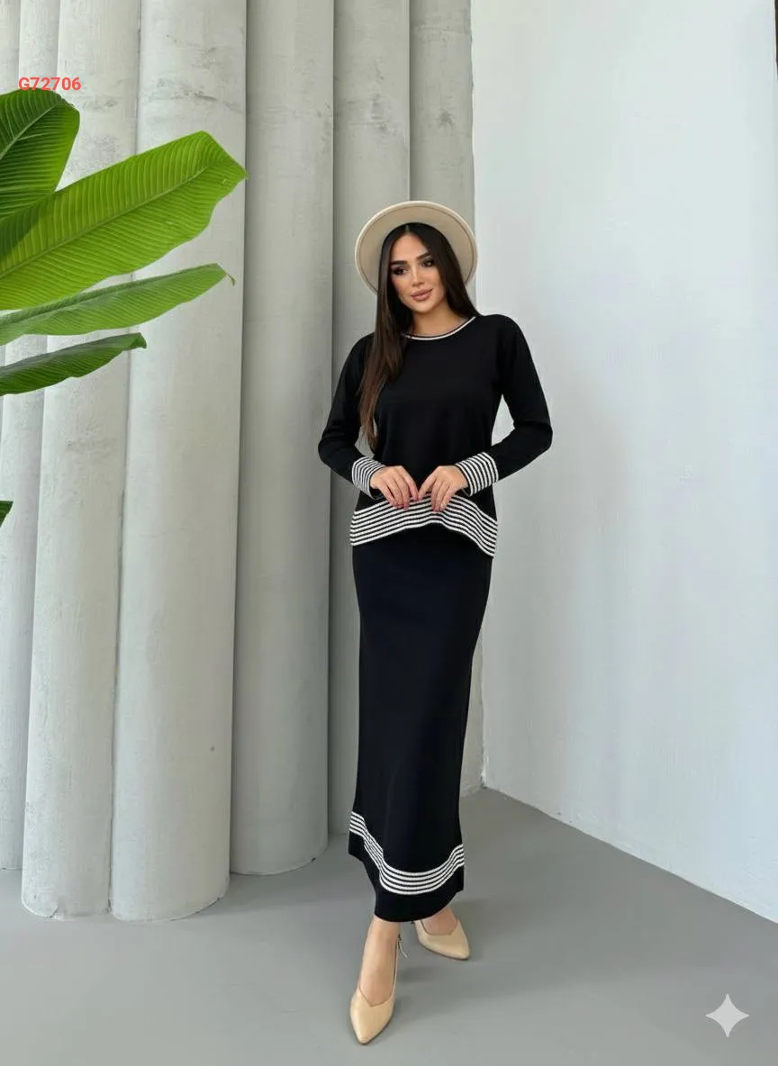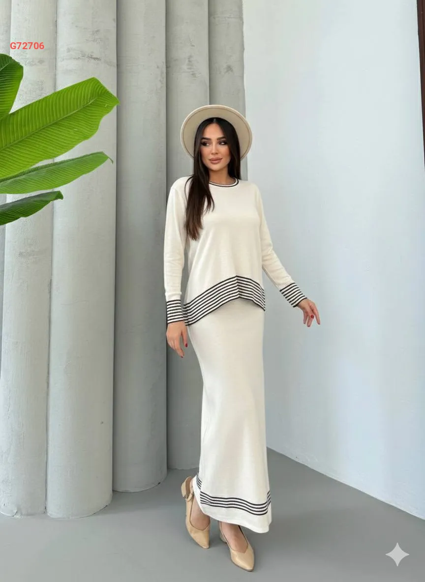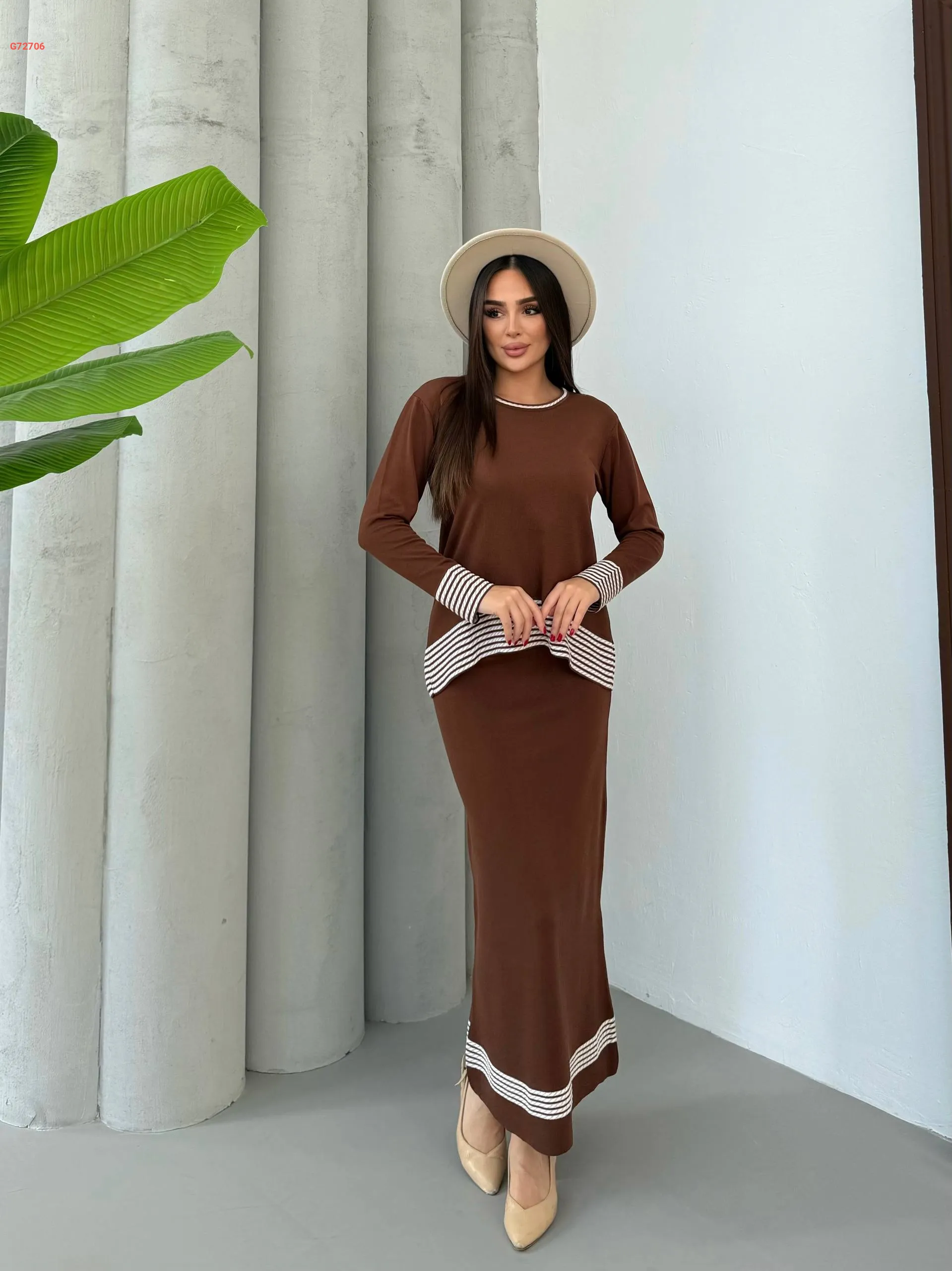 طقم تنورة تريكو طويل بتفاصيل مخططة