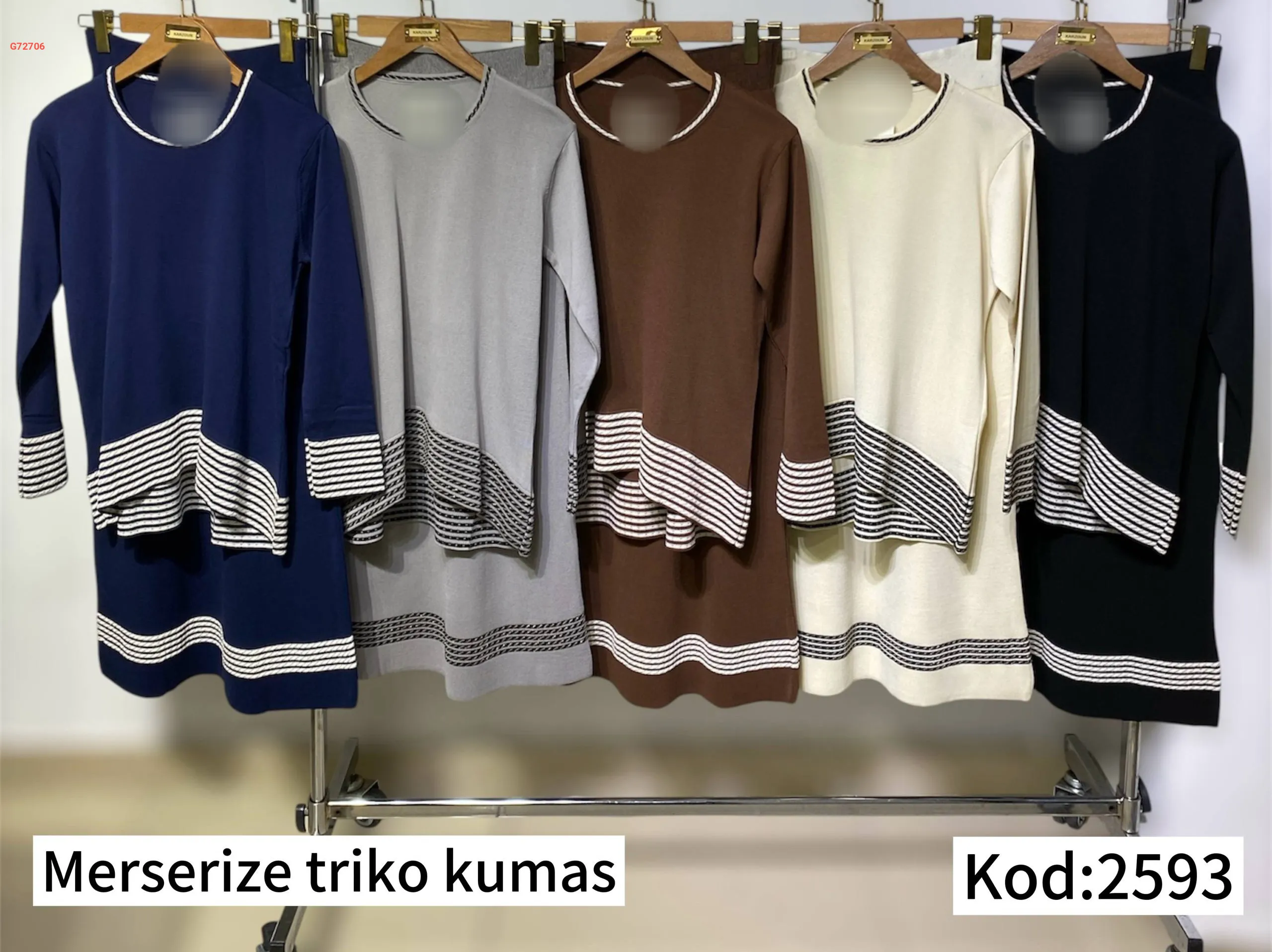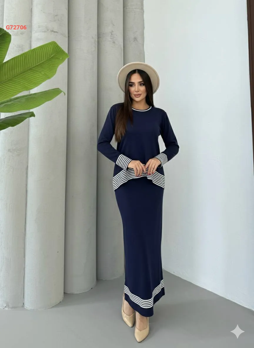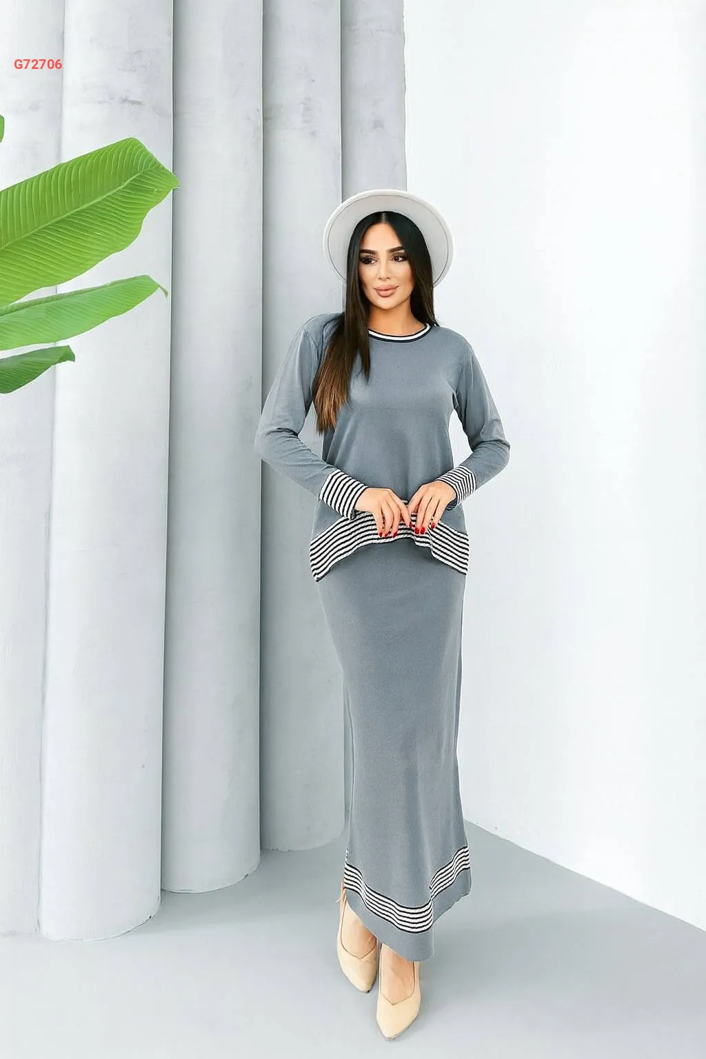 طقم تنورة تريكو طويل بتفاصيل مخططة