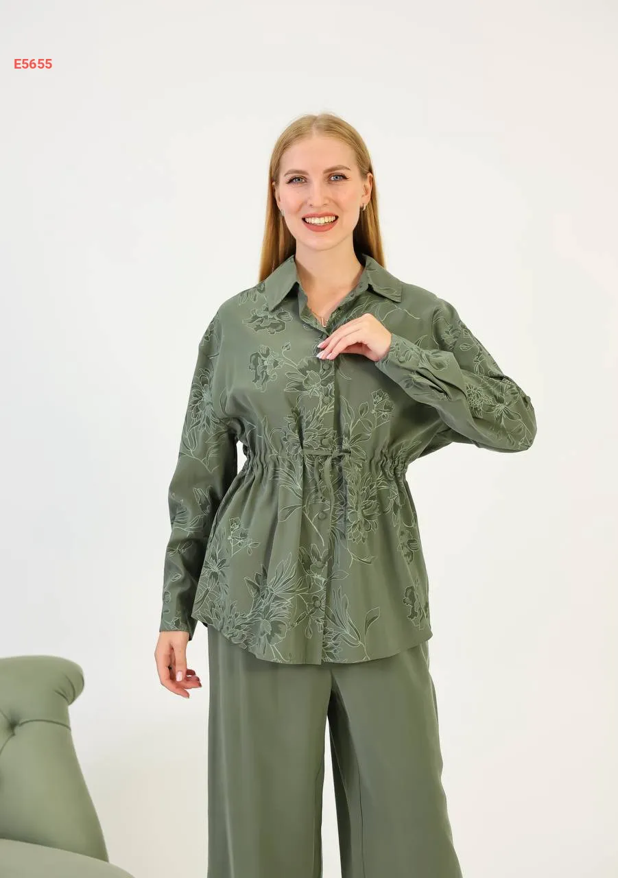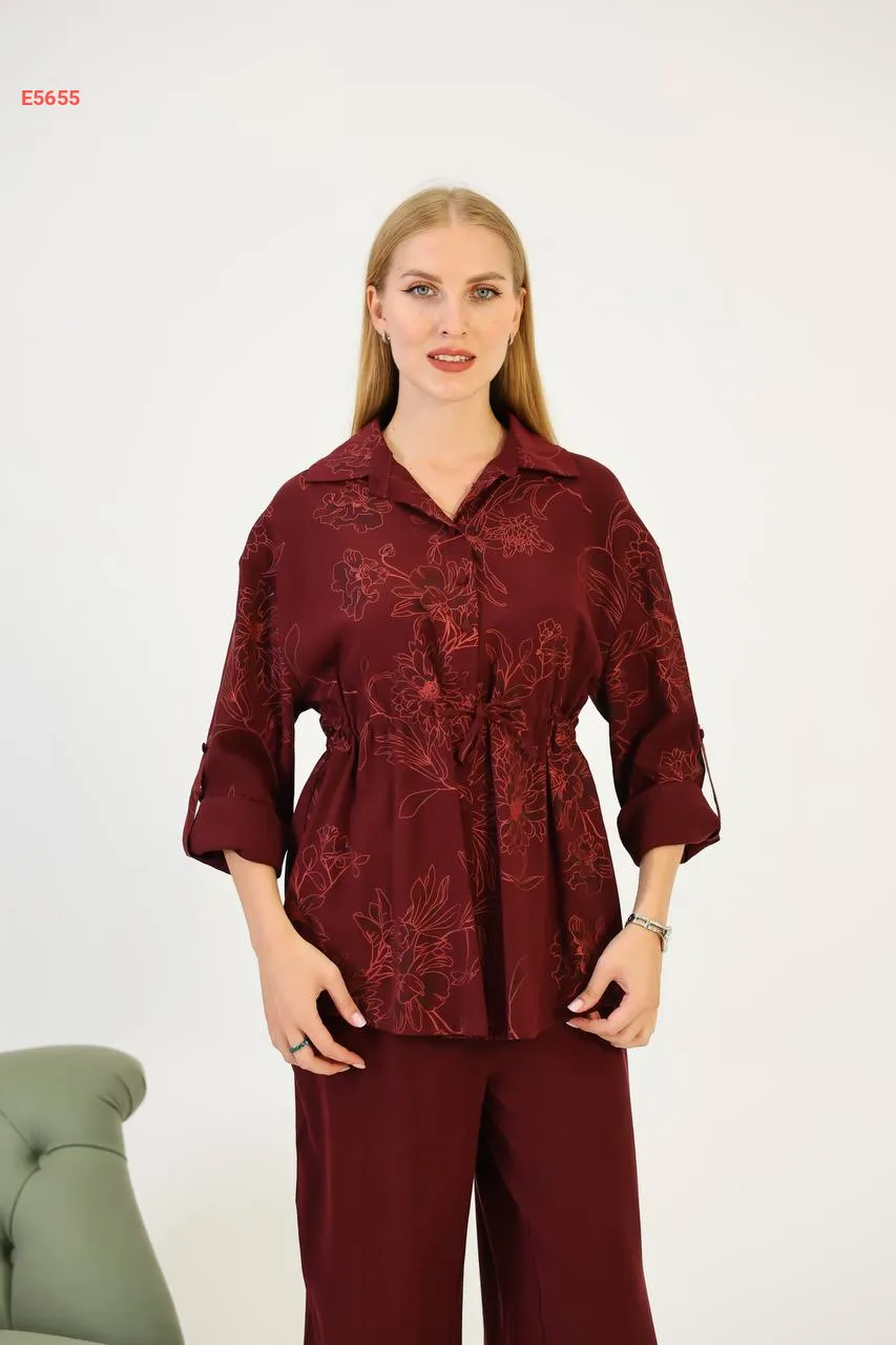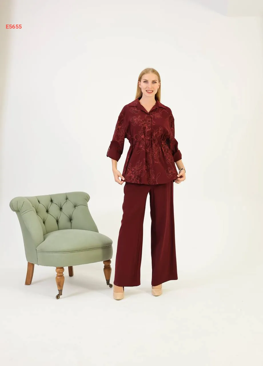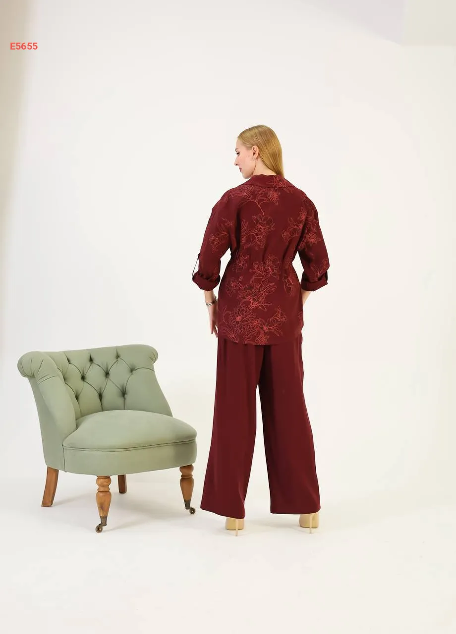 طقم قميص كم طويل منقوش مع بنطال