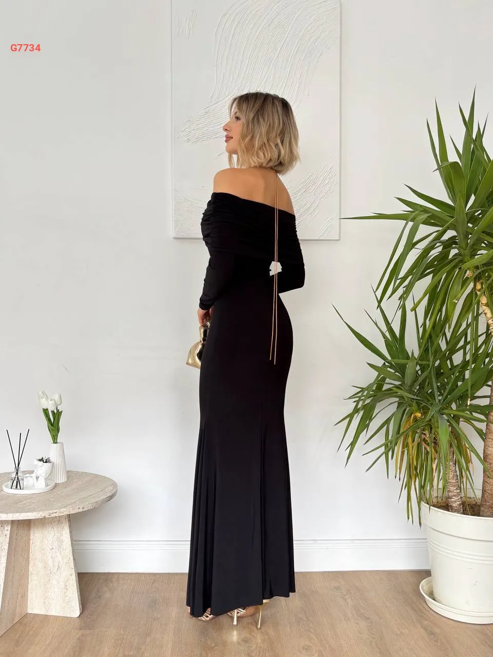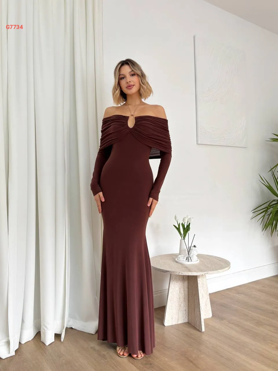 فستان طويل بياقة مادونا وإبزيم