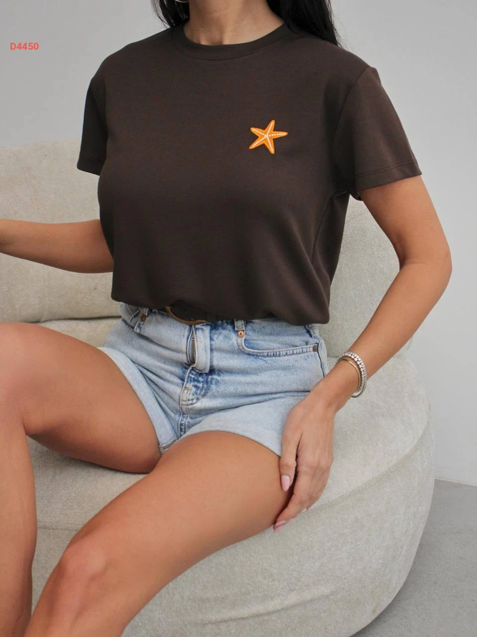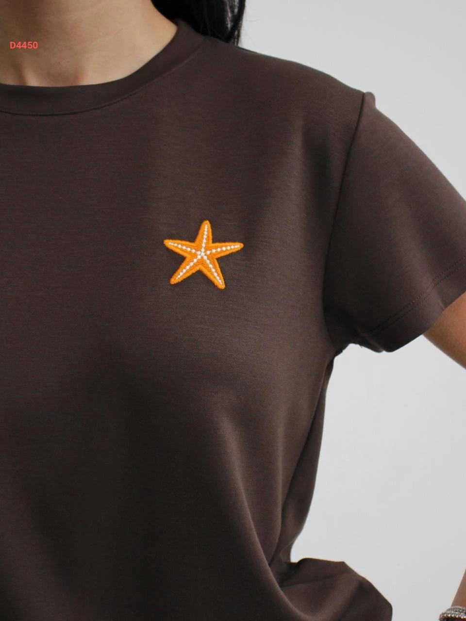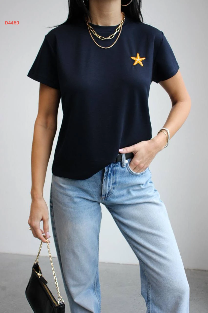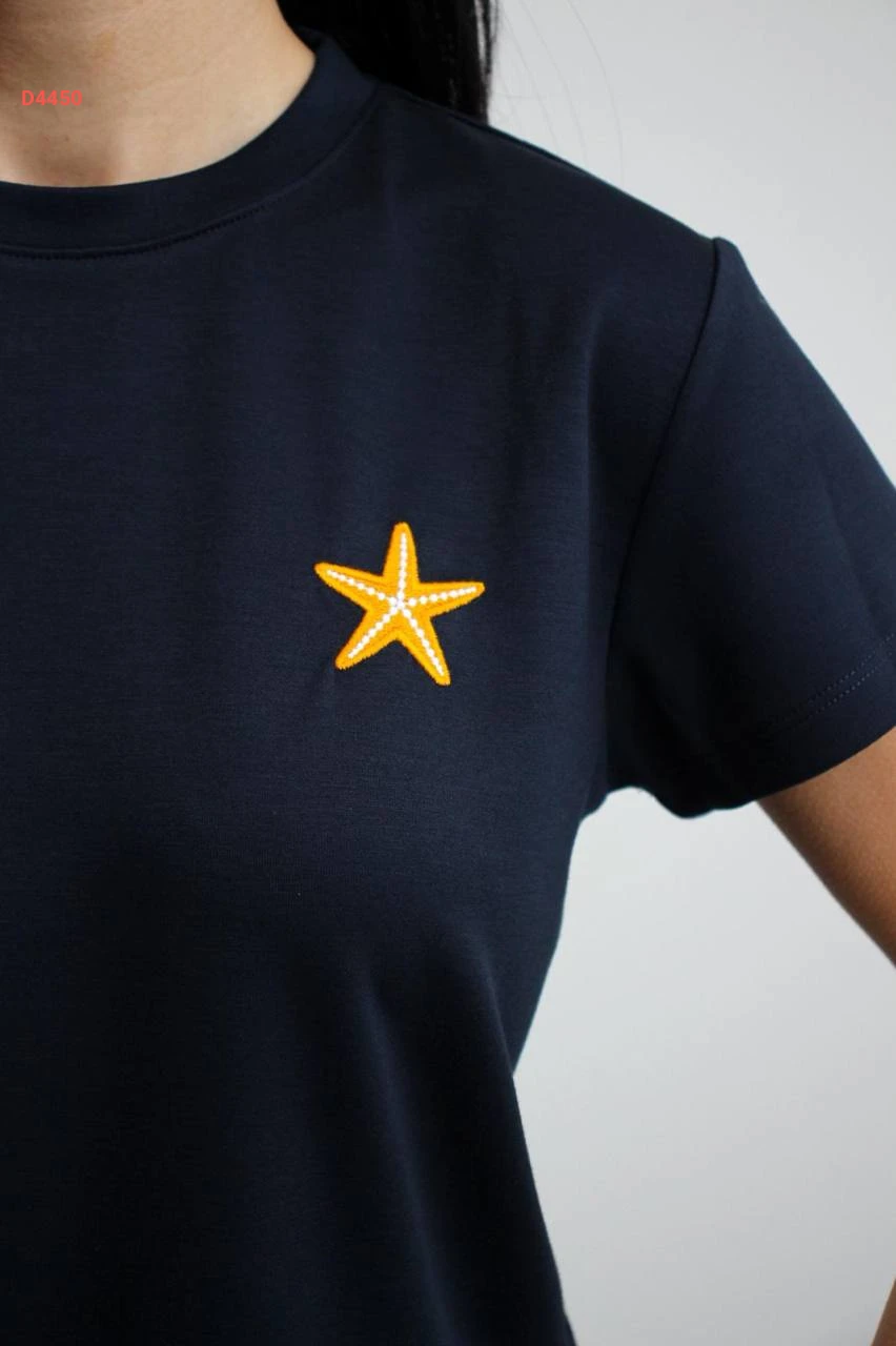 تيشيرت سادة تطريز نجمة بياقة دائرية