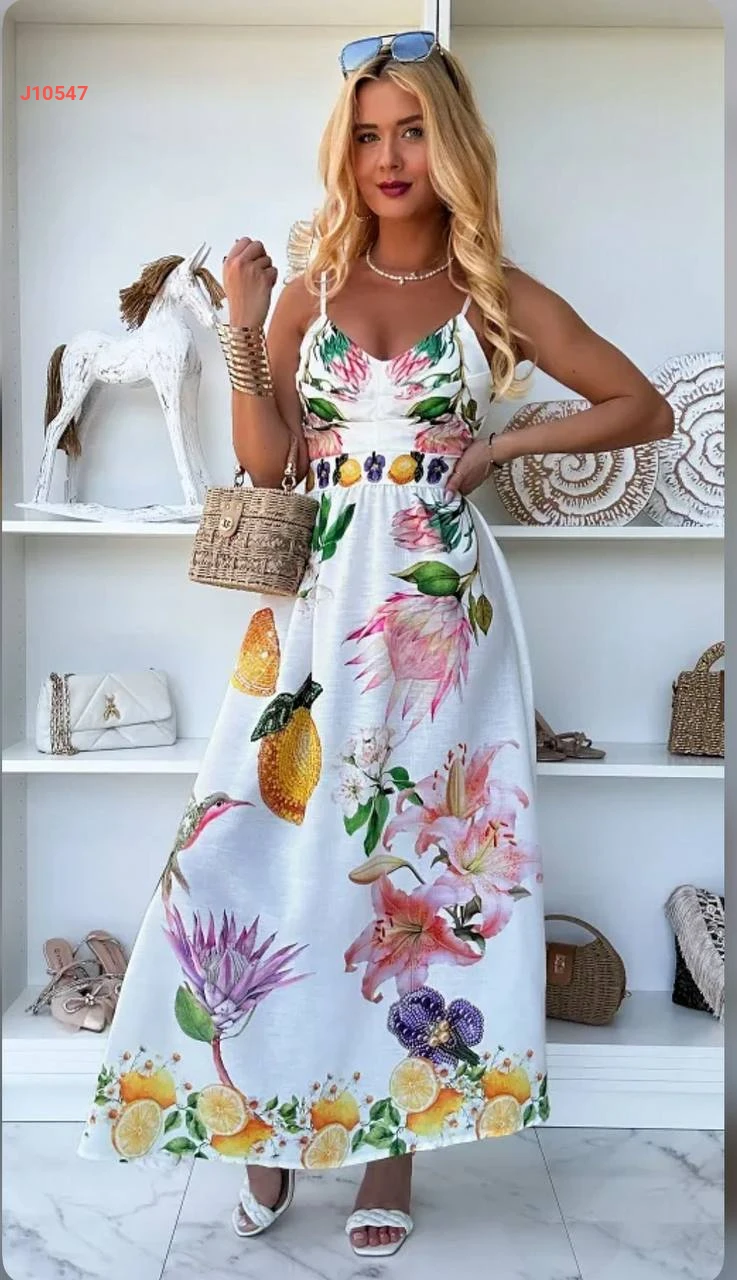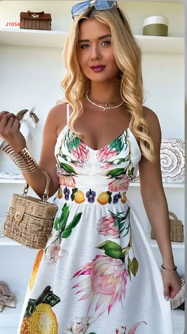 فستان كتان مطبع بحمالات رفيعة