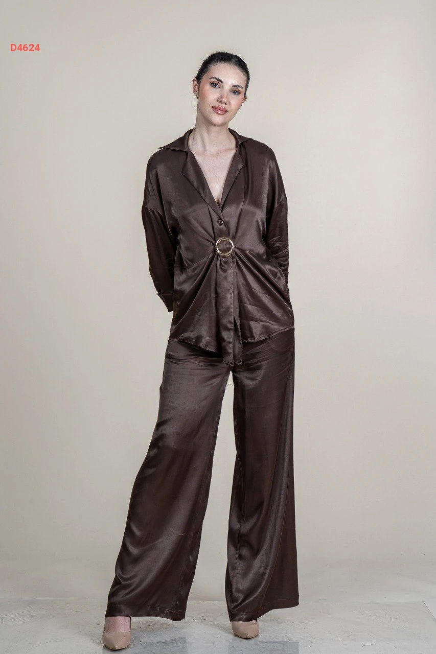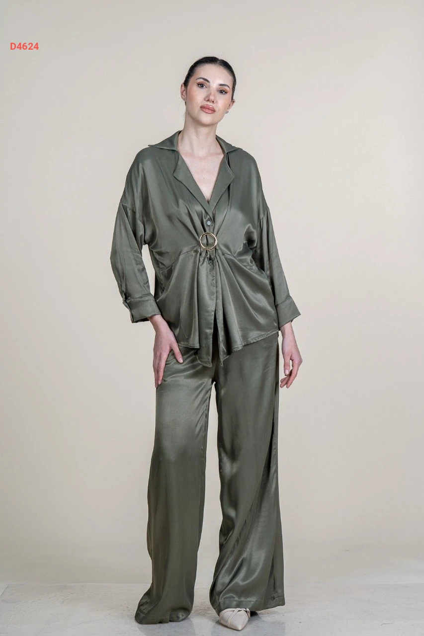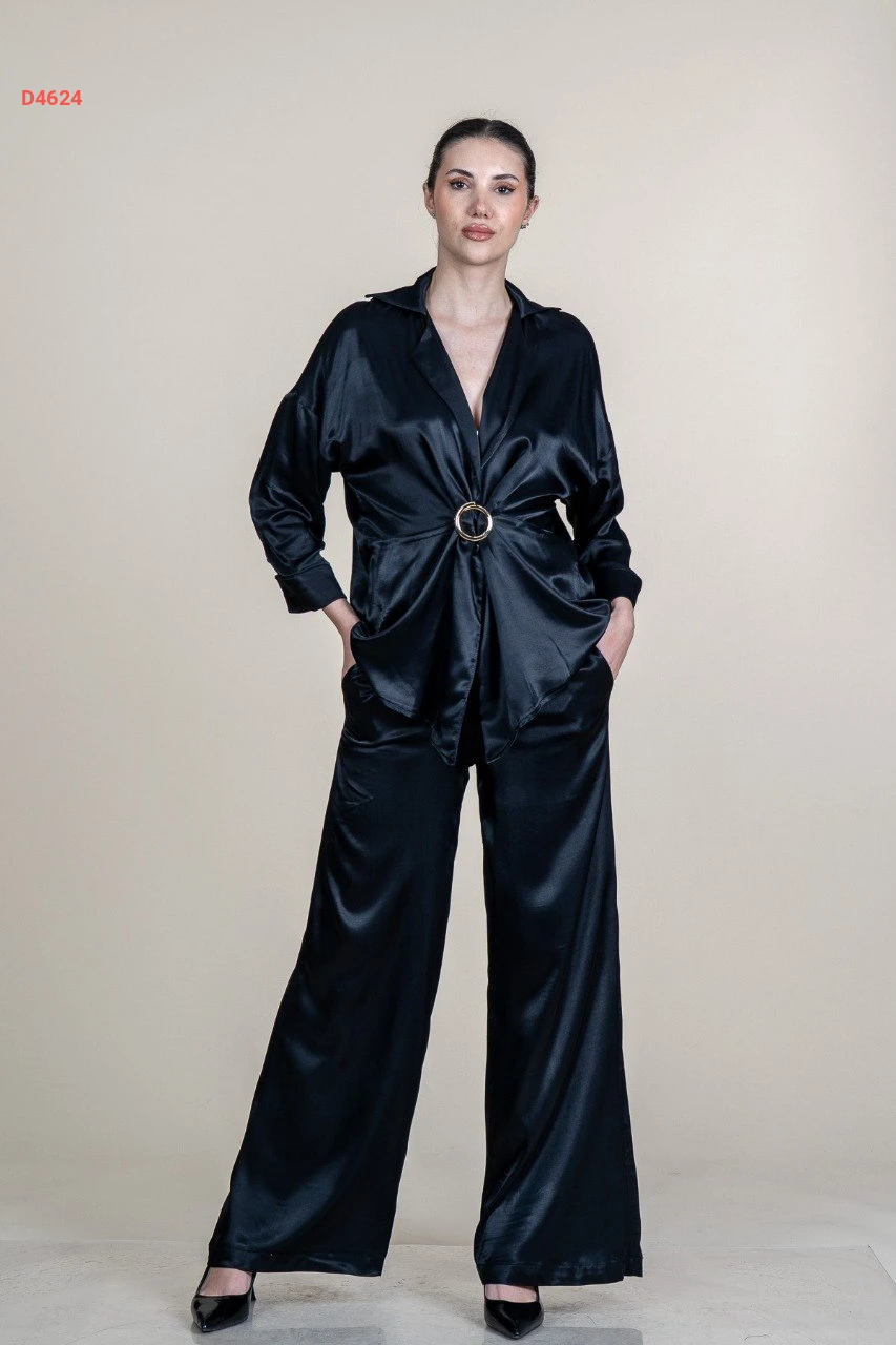 طقم بنطال ساتان وجاكيت بإبزيم