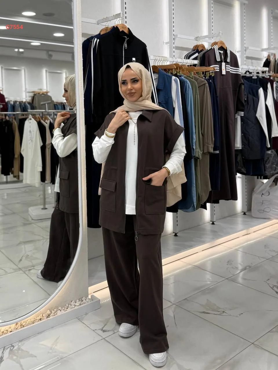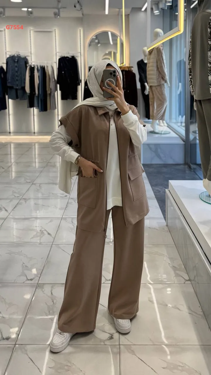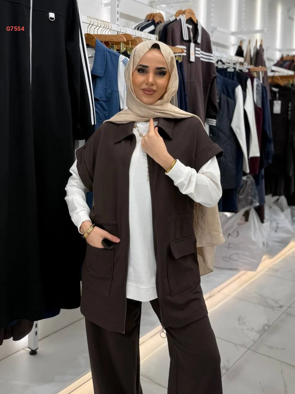 طقم يلك 3قطع سادة بسحاب وجيب عريضة وزمة عند الخصر