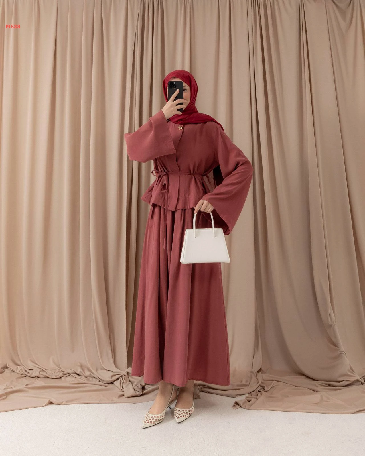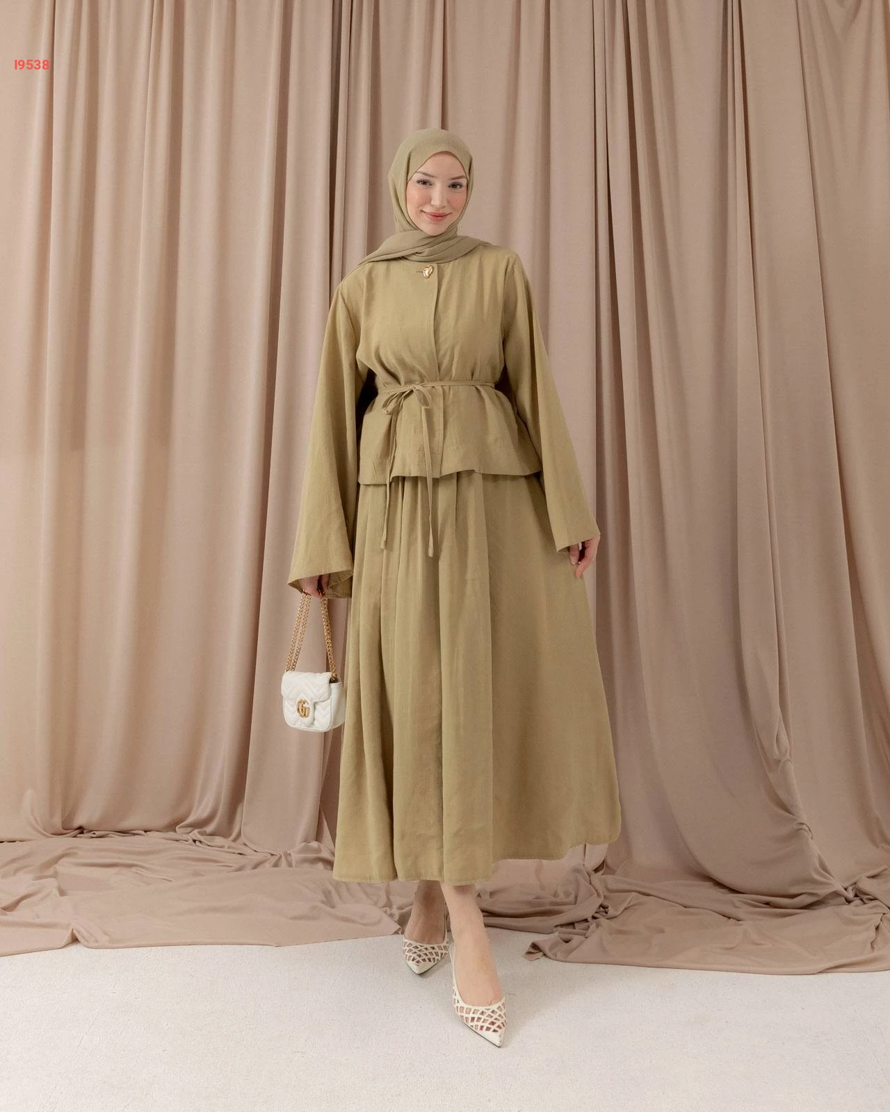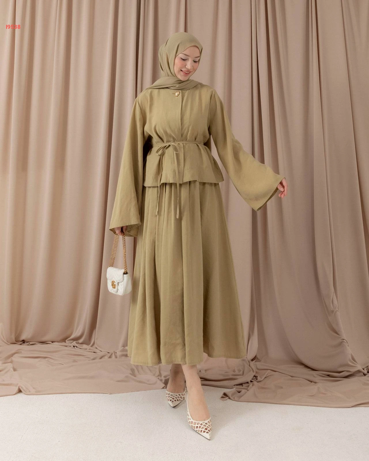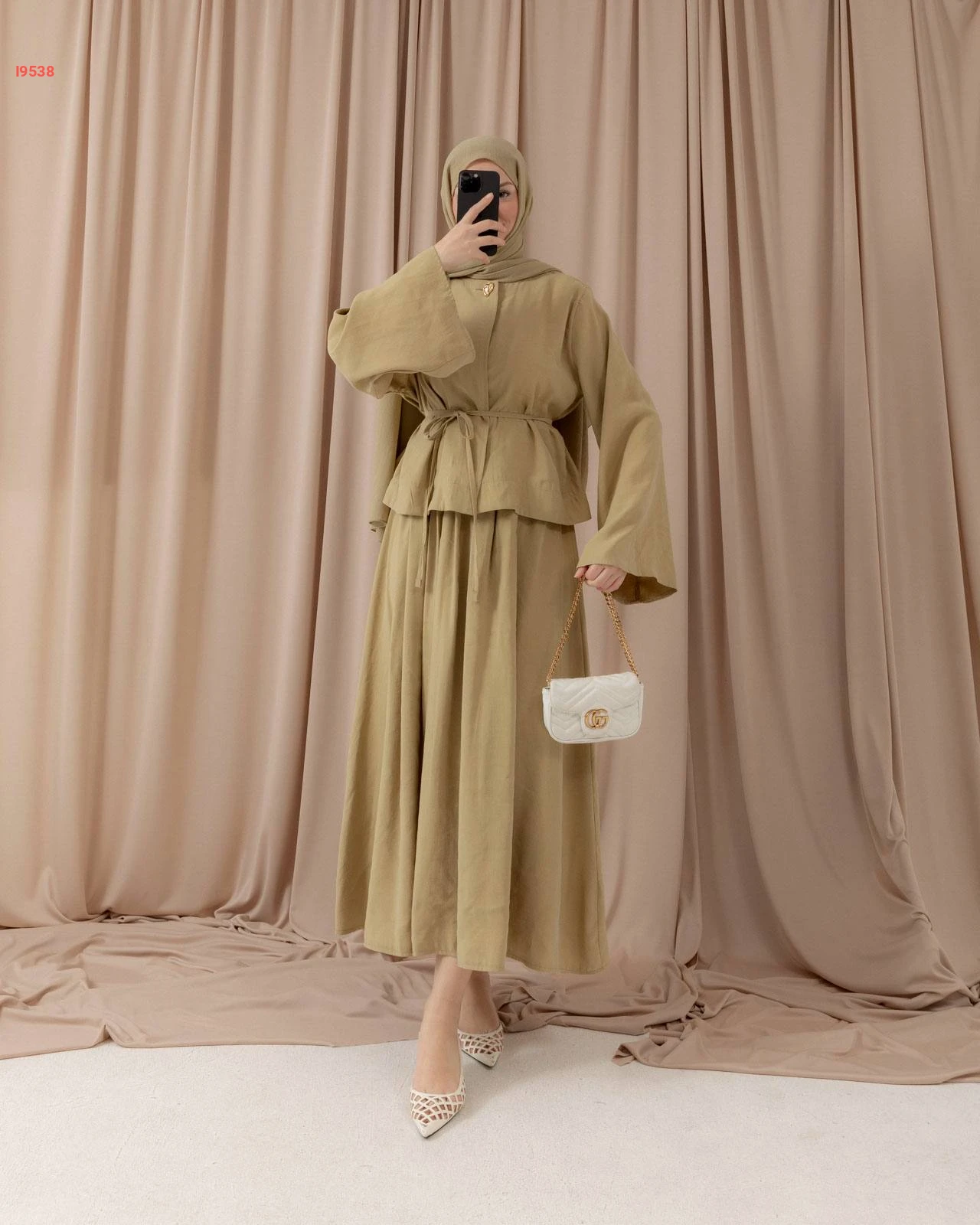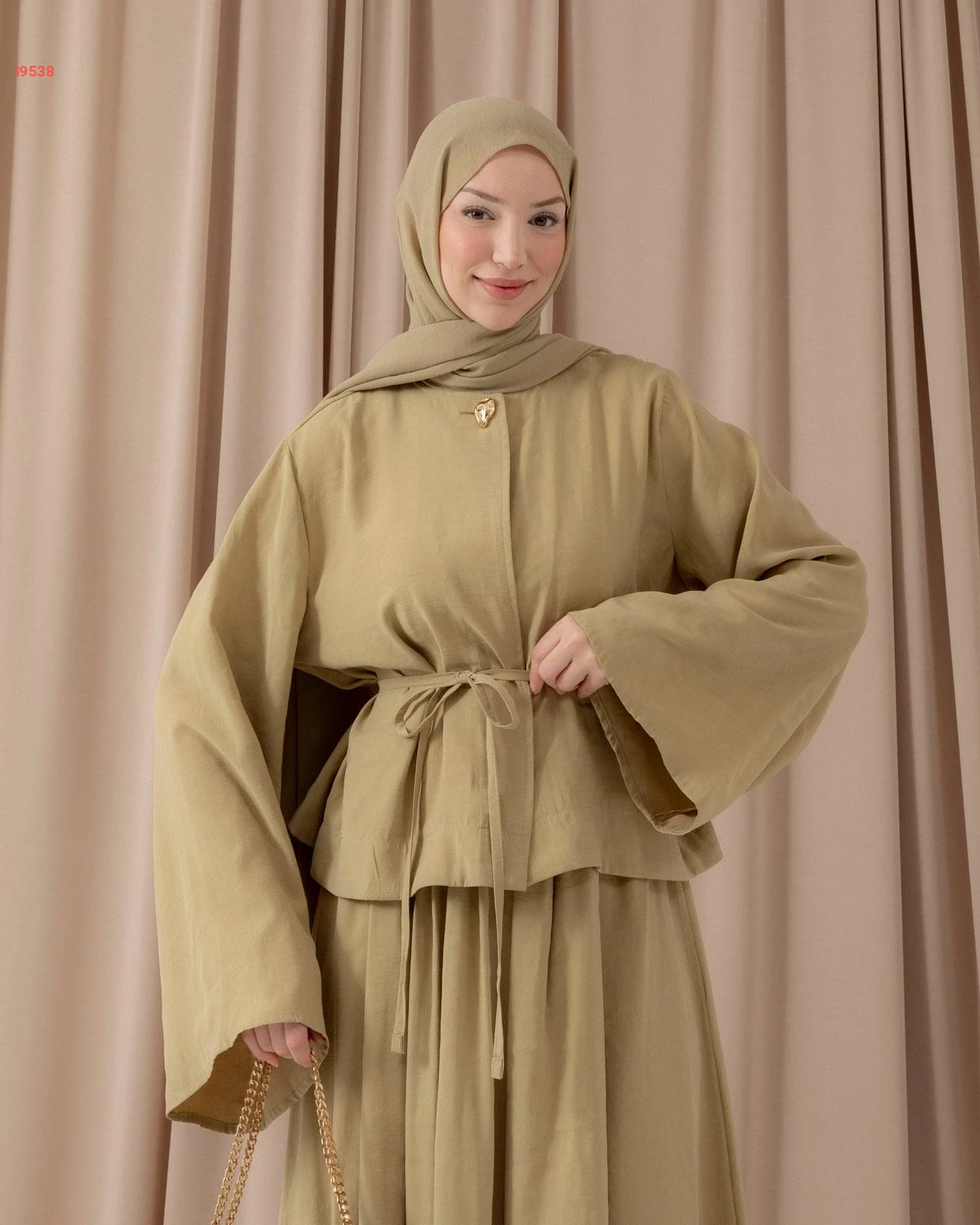 طقم بلوزة بخصر مربوط وأكمام واسعة مع تنورة منسدلة